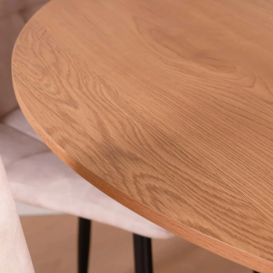 Daarnaast is de ronde vorm perfect om een gevoel van verbondenheid te creëren. Iedereen zit op gelijke afstand van elkaar, wat gesprekken natuurlijker maakt. Daardoor is deze tafel niet alleen geschikt voor dagelijks gebruik, maar ook voor gezellige etentjes of lange spelavonden. Door zijn formaat past hij moeiteloos in zowel compacte eetruimtes als grotere woonkeukens. Bovendien laat de neutrale eikenlook zich uitstekend combineren met uiteenlopende stoelstijlen — van minimalistisch Scandinavisch tot stoer industrieel.