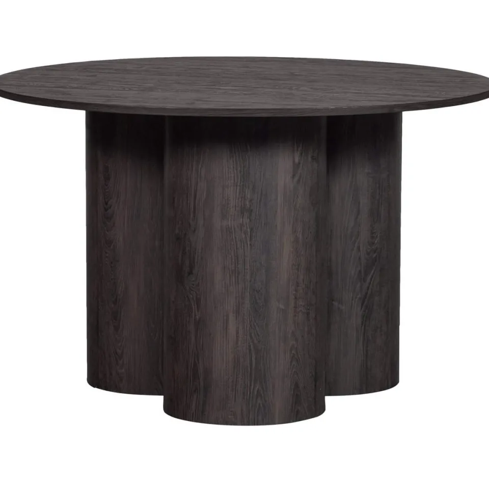 Een uniek en robuust design: dat haal je in huis met deze Oona eettafel. De ronde eettafel komt uit de Exclusive collectie van het Nederlandse interieurmerk WOOOD. De tafel is vervaardigd uit MDF, met een tafelblad dat is afgewerkt met 3D papier. De donkerbruine finish met duidelijke houtnerven maakt dat de eettafel een warme uitstraling heeft en goed past in een botanisch, retro of boho interieur. Het MDF plaatmateriaal uit onze collecties wordt gevormd uit geperste houtvezels welke onder druk worden verkleefd met behulp van hars. Hierdoor heeft dit materiaal een zeer glad oppervlakte. 3D papier is een materiaal om een driedimensionaal effect of textuur te creëren op bijvoorbeeld een tafelblad. Dit kan gedaan worden door het papier in lagen of patronen te snijden, te vouwen of te drukken, zodat er een diepte- of reliëfeffect ontstaat. Een meubel afgewerkt met 3D papier meubelen geeft een artistieke en unieke uitstraling, maar heeft beperkte structurele sterkte en is gevoelig voor vocht en slijtage.