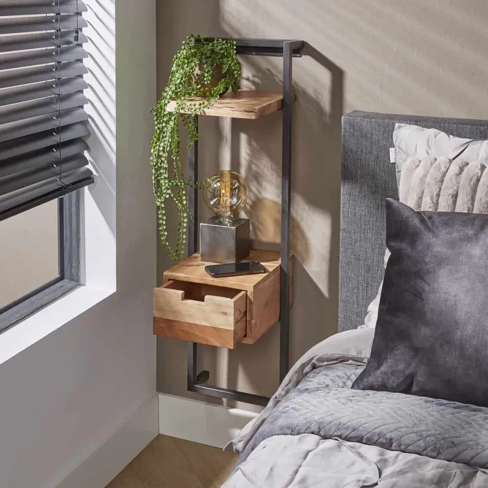 Nachtkastje Danies is gemaakt van acaciahout, afgewerkt met een matte, transparante lak. Het metalen frame zorgt voor een stevige constructie. Het metalen frame wordt eenvoudig aan de muur bevestig doormiddel van een strip met drie schroefgaten. Aan de strip kan het nachtkastje veilig worden opgehangen. Zie afbeelding voor meer details.