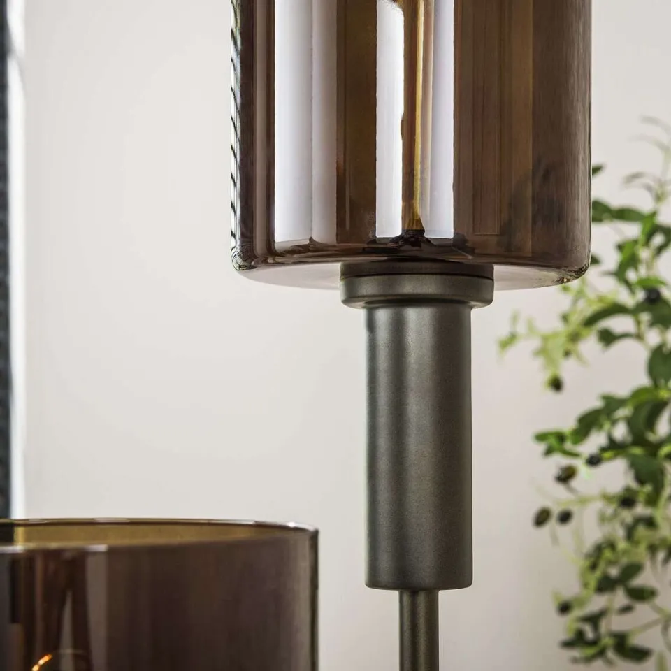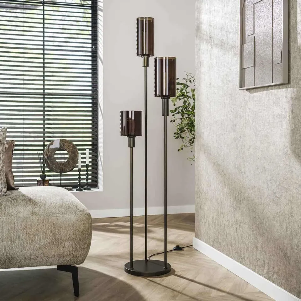 Vloerlamp Leentje is uitgevoerd met een metalen armatuur in een bronskleurige afwerking. Het ontwerp bestaat uit drie glazen kappen die op verschillende hoogtes zijn geplaatst aan een slanke, verticale staander. De combinatie van getint glas en het warme bronskleurige metaal geeft de lamp een elegante en eigentijdse uitstraling.