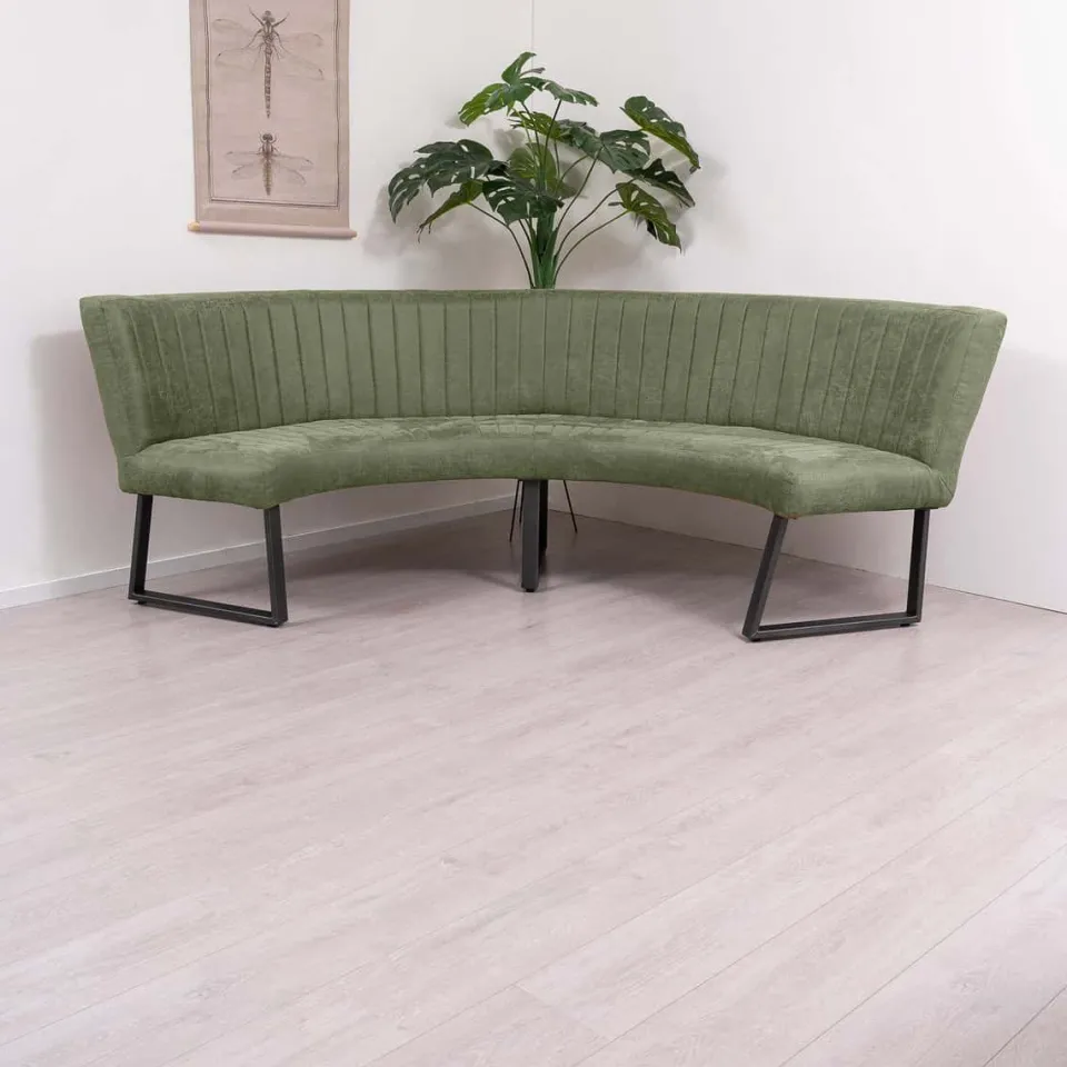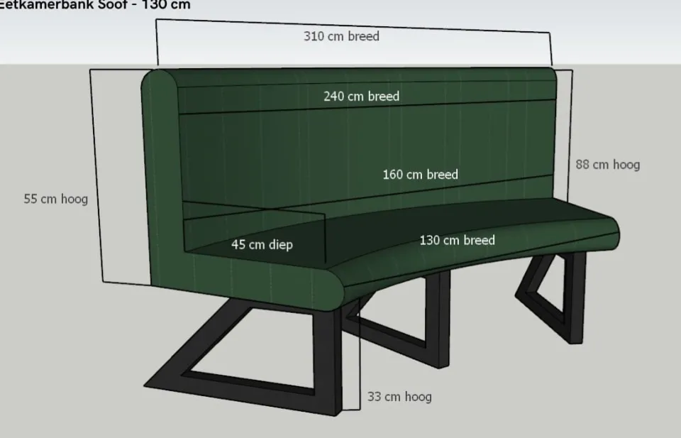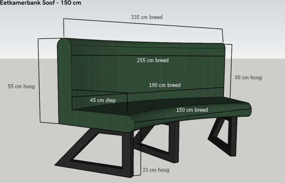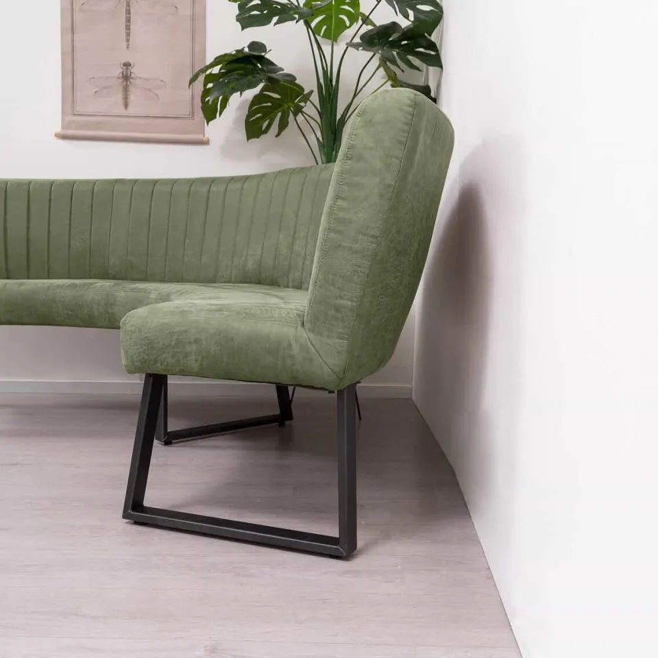 De Eetkamerbank Soof van HUUS combineert comfort met een stijlvolle uitstraling. Dankzij de afgeronde vormgeving sluit Soof perfect aan bij ronde eettafels, zoals de Monique. Bekleed met hoogwaardige Missouri-stof en ondersteund door een stevig metalen frame, biedt deze bank een moderne look en stabiele zit. Verkrijgbaar in de kleuren groen, antraciet en cognac, en in lengtes van 130 cm en 150 cm, past Soof moeiteloos in diverse interieurstijlen. Met een zithoogte van 50 cm en een rugleuning van 90 cm is langdurig tafelen gegarandeerd comfortabel.