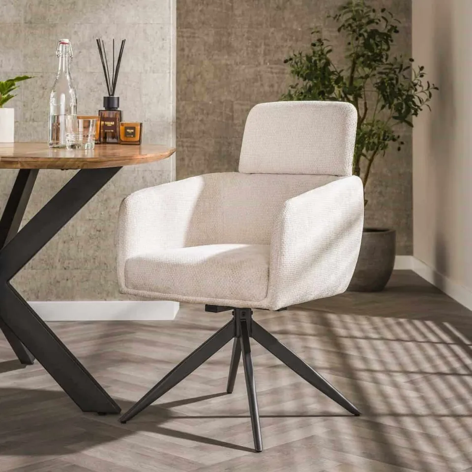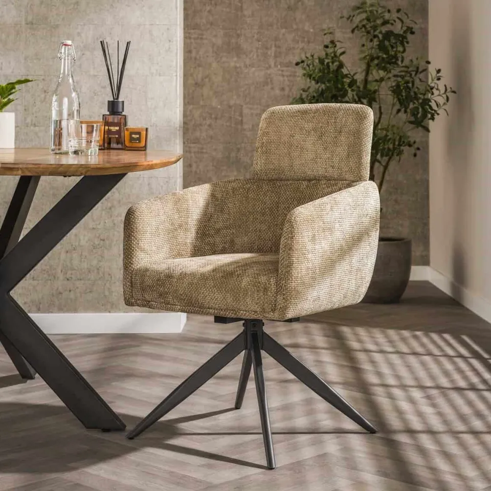 Eetkamerstoel Harrie is een eigentijdse draaistoel met opvallend comfort en een stoere uitstraling. De zitting is bekleed met renegade stof, een sterke en robuuste bekleding die goed bestand is tegen dagelijks gebruik. Het zwarte metalen draaiframe geeft de stoel een modern accent en zorgt voor extra gebruiksgemak. Dankzij de ingebouwde pocketvering biedt Harrie een verrassend hoog zitcomfort. Deze stoel wordt geleverd in een set van twee stuks — ideaal voor aan een robuuste houten tafel of in een industriële eetkamer.