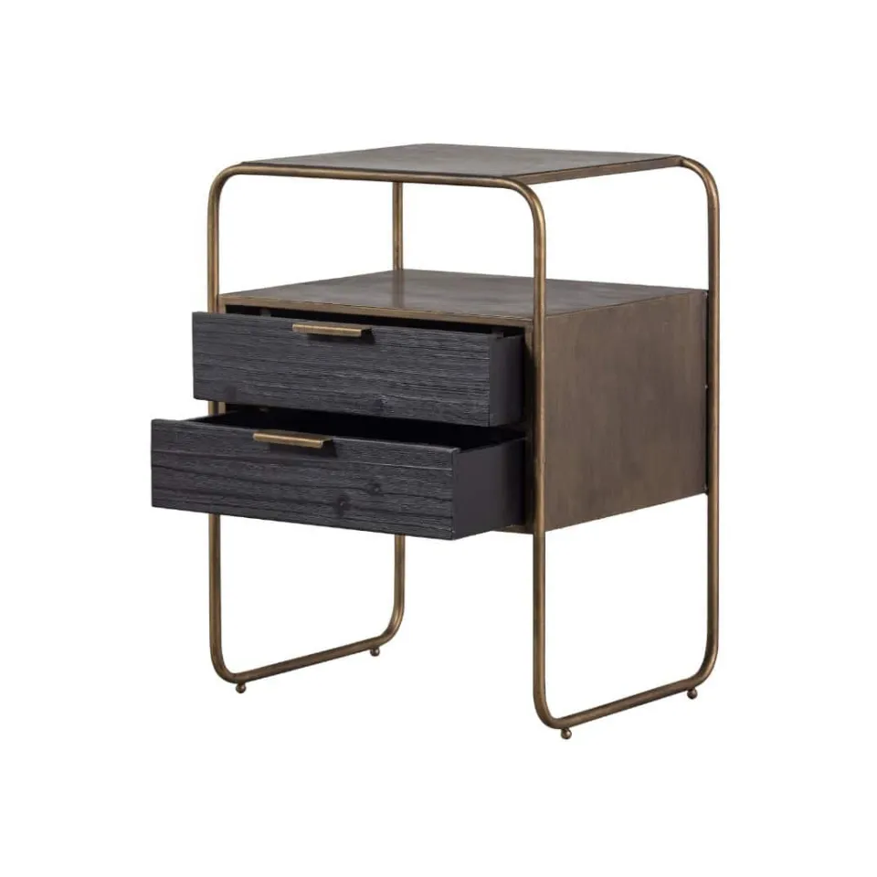 Polite is gemaakt van sterk metaal met een antique brass poedercoating. Dit sterke materiaal kan wel tegen een stootje, maar houdt niet van nattigheid, hierdoor kan snel roest ontstaan. De twee lades zijn gemaakt van hout met een zwarte kleuring. Het robuuste hout heeft een duidelijke nerftekening wat het kastje een stoere uitstraling geeft.