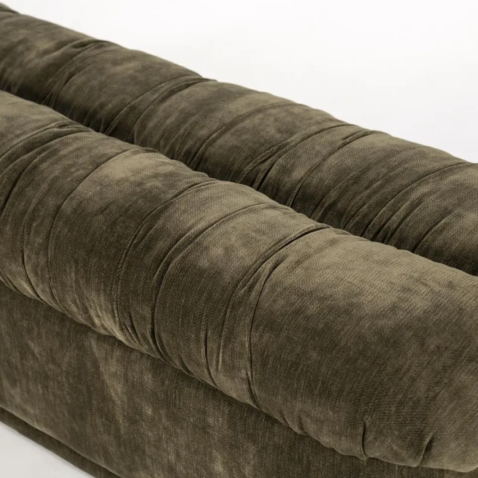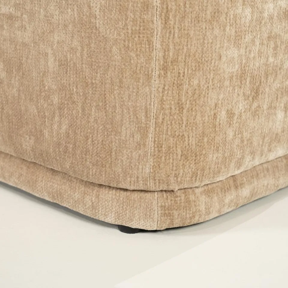 Het bankje is bekleed met een zachte stof die prettig aanvoelt en direct comfort toevoegt aan het interieur. De subtiele plooien en het volumineuze zitvlak geven Nook een speels karakter, terwijl het geheel toch rustig blijft ogen. Daarnaast zorgt de stevige vulling voor een aangenaam zitgevoel, waardoor het bankje niet alleen decoratief is, maar ook praktisch in gebruik. Of je Nook nu gebruikt als extra zitplek, als bankje in de hal of aan het voeteneinde van het bed, het ontwerp blijft comfortabel en in balans.