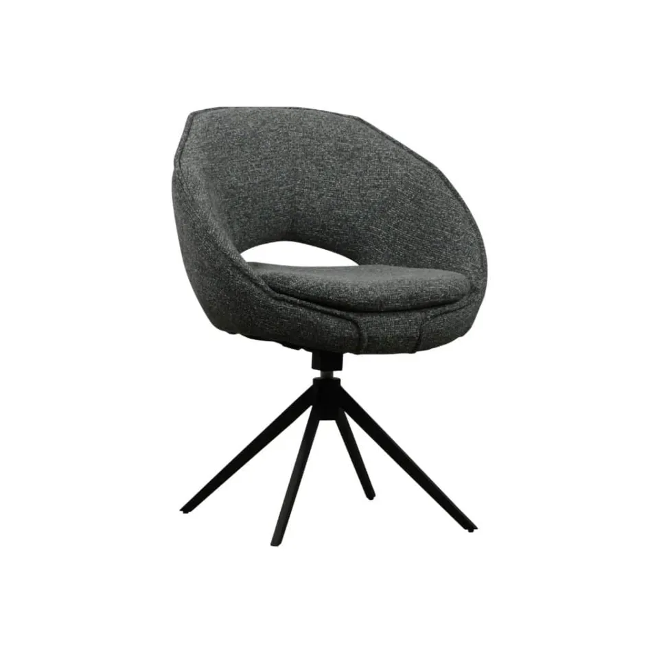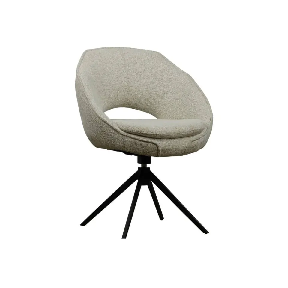 Eetkamerstoel Bruce combineert modern design met een uitnodigend zitcomfort. De ruime zitting is bekleed met een zachte stof in een rustige, neutrale kleur en biedt comfortabele steun tijdens lange diners. Het zwarte metalen onderstel met kruisvormige pootconstructie geeft de stoel een stoere uitstraling. Dankzij de draaifunctie is Bruce extra praktisch in gebruik, zowel aan de eettafel als in een vergaderruimte.