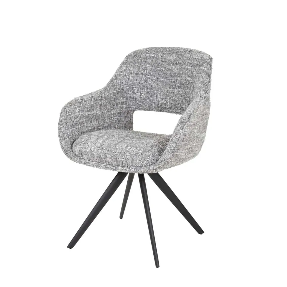 Eetkamerstoel Montana is een luxe draaistoel met een elegante uitstraling en aangenaam zitcomfort. De zitting is bekleed met een grof geweven stof van gemêleerd slubgaren, wat zorgt voor een rijke textuur en een verfijnde look. Het zwarte metalen onderstel geeft de stoel een moderne basis en is voorzien van een draaifunctie, ideaal voor extra bewegingsvrijheid aan tafel. Montana wordt geleverd in een set van twee stuks en past perfect in een stijlvol, eigentijds interieur.
