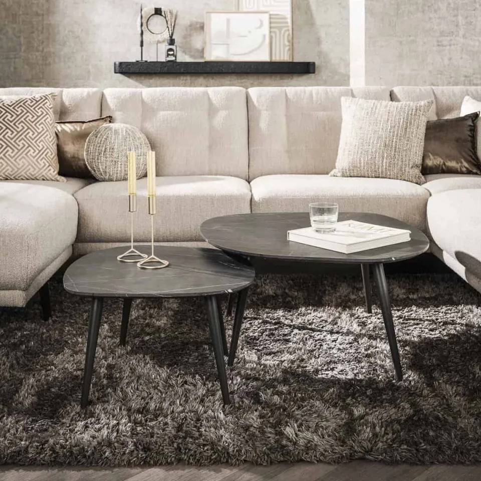 Deze salontafel set van 2 is uitgevoerd in melamine met een keramiek uitstraling en frame in staal. De tafel is haast niet te onderscheiden van een keramiek tafel. Het handgemaakte tafelblad is voorzien van een laagje melaminehars dat is aangebracht op hout. Het materiaal wordt door hitte en druk aangebracht. Het prachtige materiaal in combinatie met de peervorm, geeft een trendy, maar tegelijk ook tijdloze tafel.