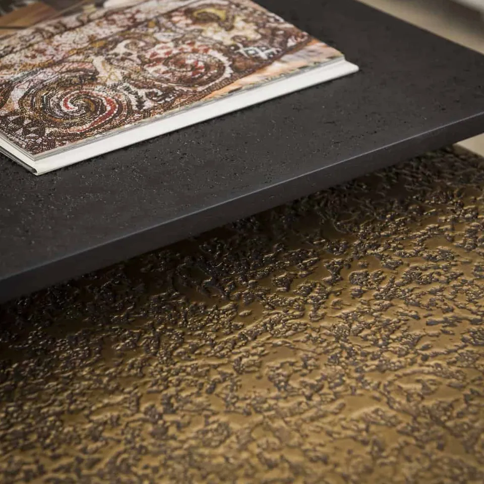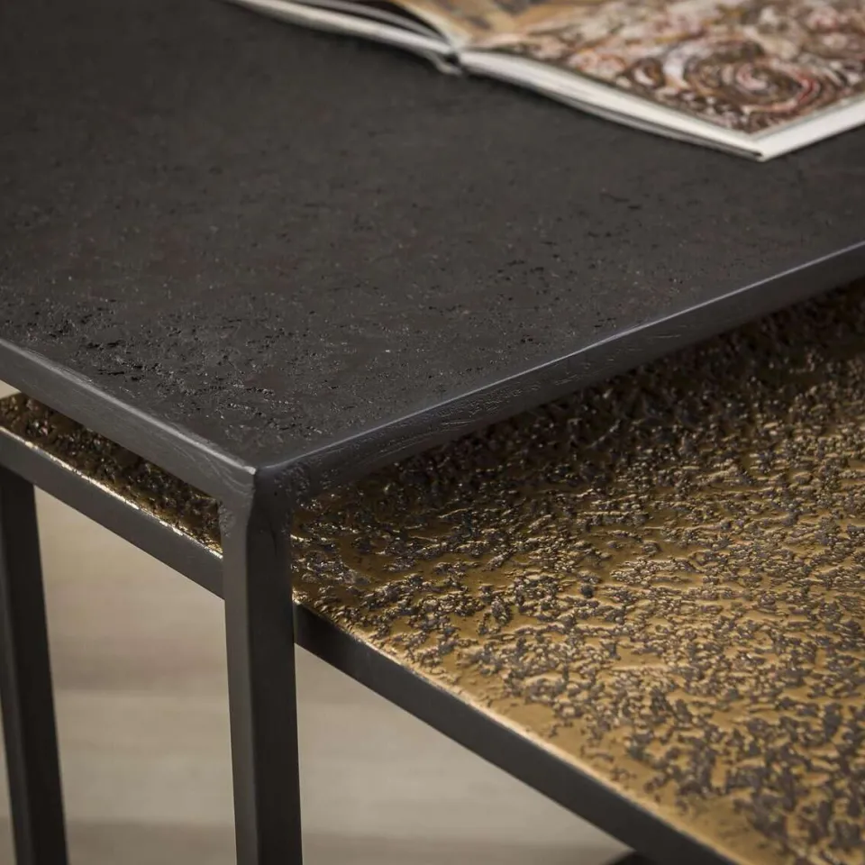 Deze trendy salontafel set van 2 is uitgevoerd in ‘metallic’ antiek brons en zwart. Op het blad zit een hele mooie bewerking welke een unieke uitstraling geeft. De tafels kunnen naar eigen inzicht speels bij elkaar neergezet worden. Deze set is een echte eye-catcher en maakt deel uit van de ‘metallic’ serie.