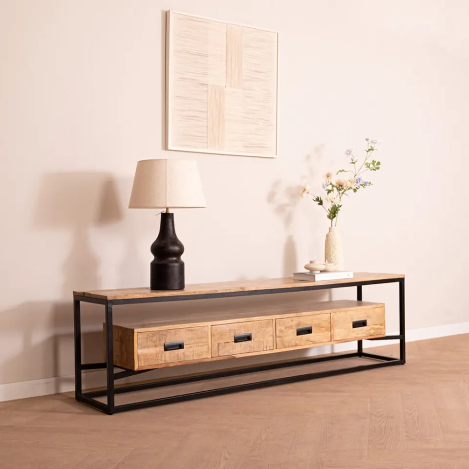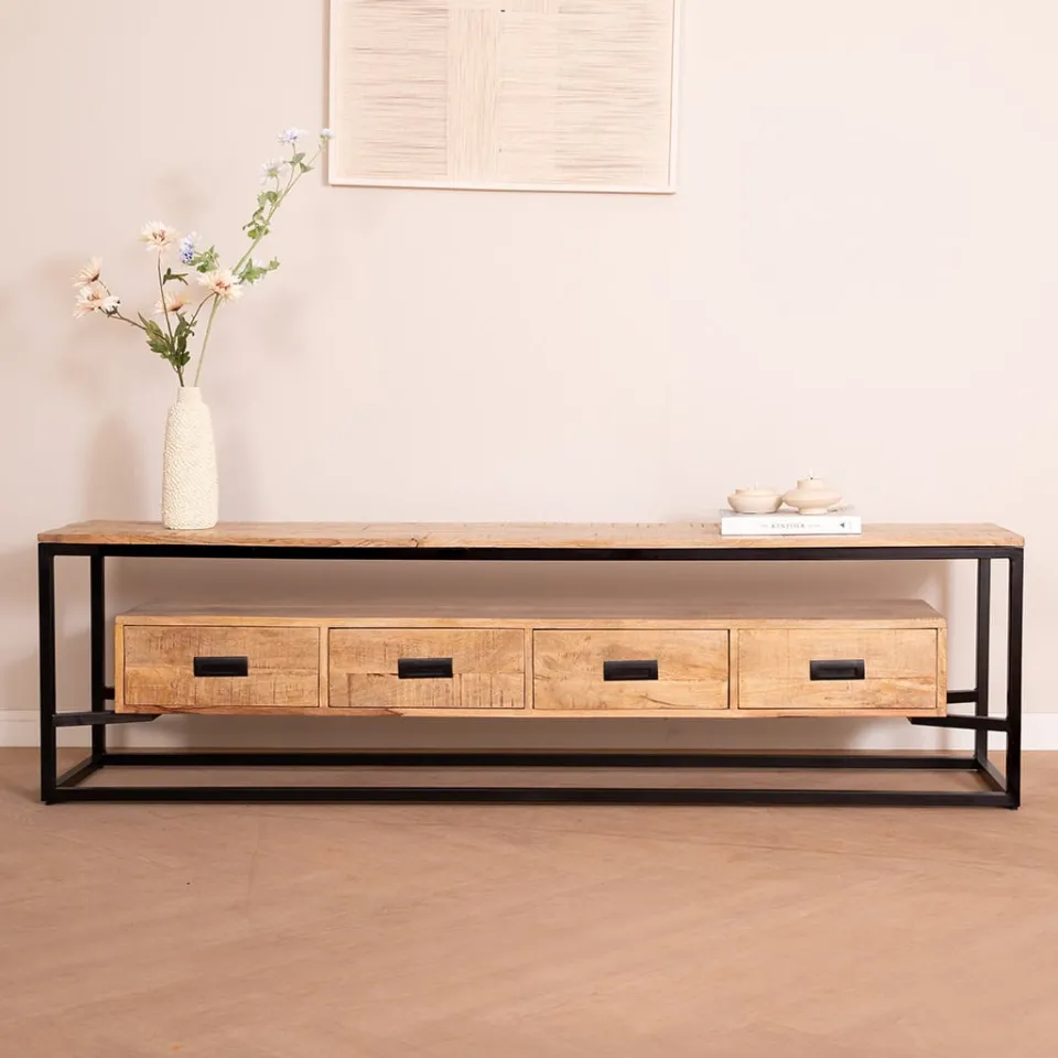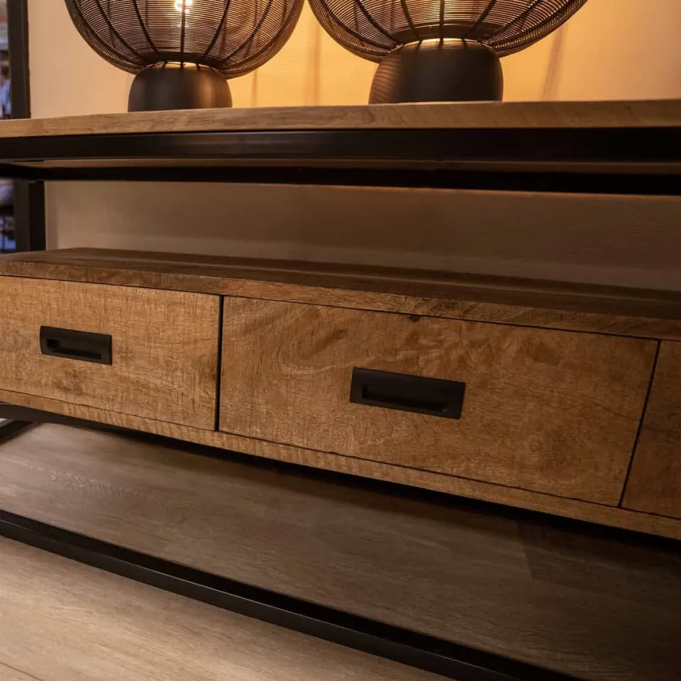 Het tv-meubel is gemaakt van hoogwaardig mangohout, wat zorgt voor een warme en authentieke uitstraling. Het zwevende ontwerp voegt niet alleen een stoere, moderne touch toe, maar maakt het ook makkelijk schoon te houden, zodat het altijd zijn charmante uitstraling behoudt.
