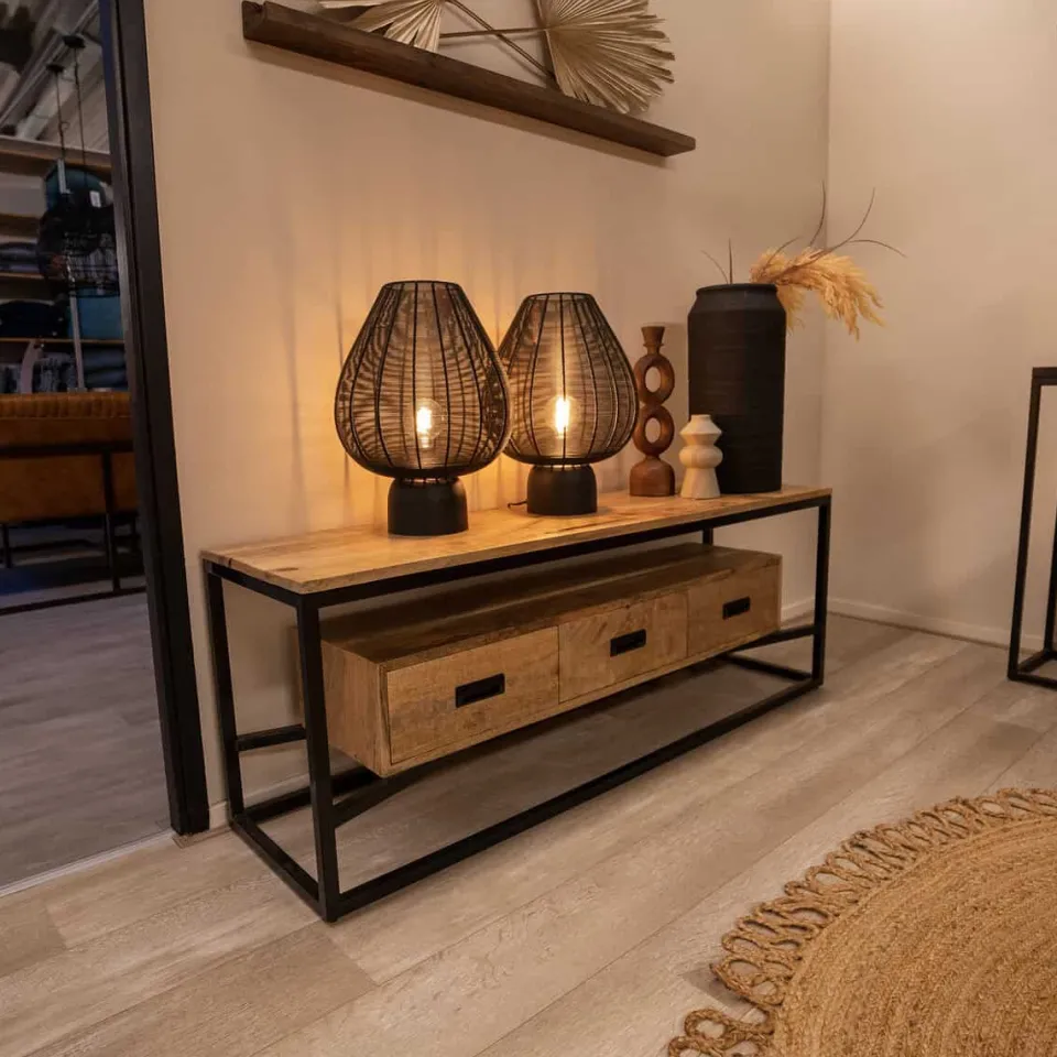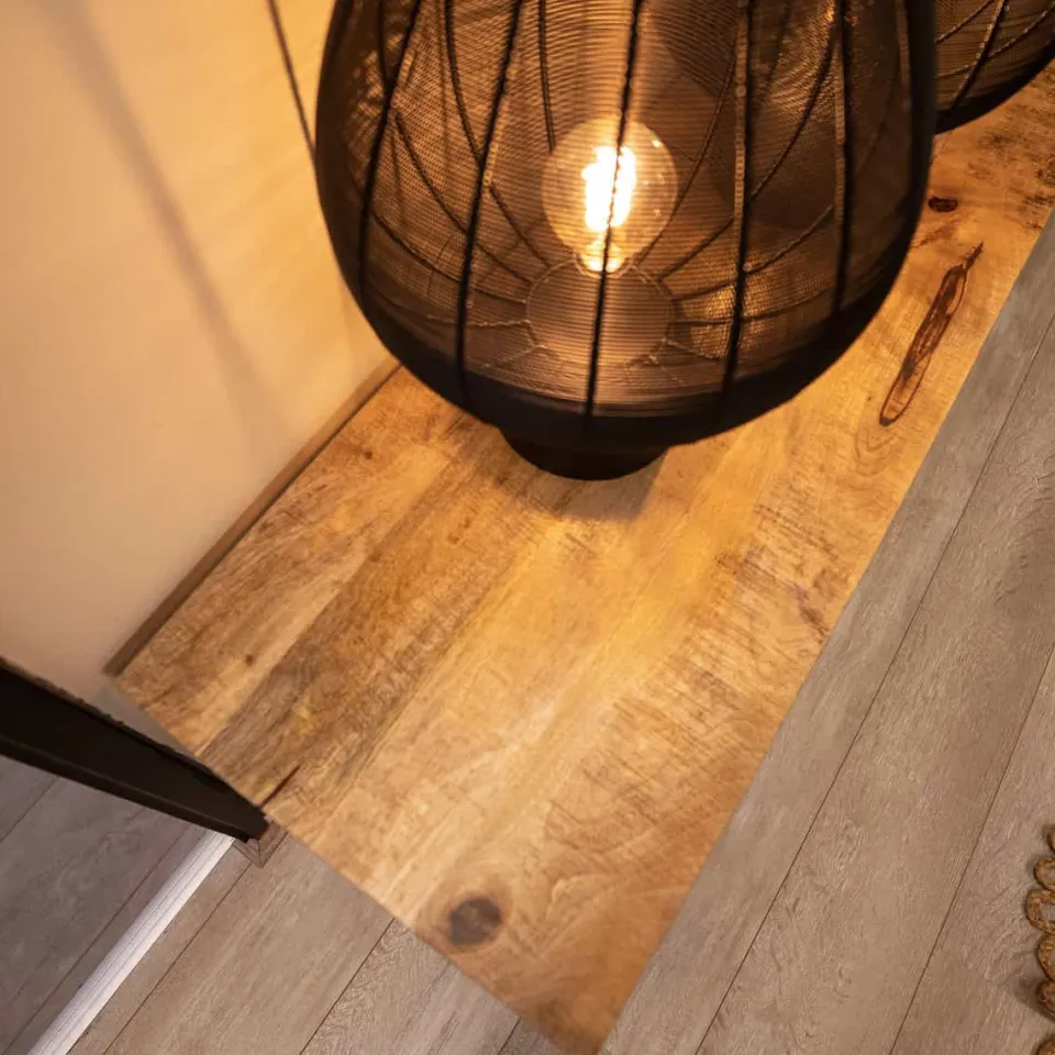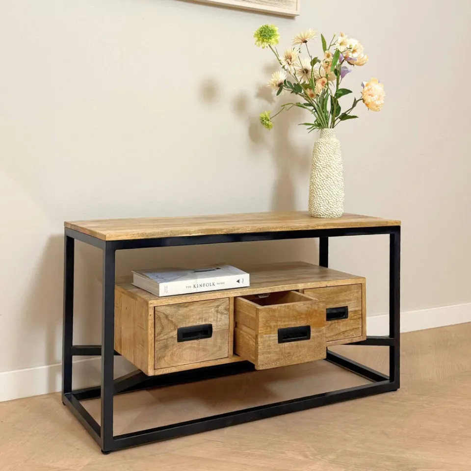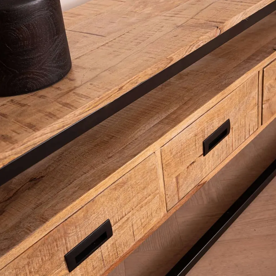 Het tv-meubel is gemaakt van hoogwaardig mangohout, wat zorgt voor een warme en authentieke uitstraling. Het zwevende ontwerp voegt niet alleen een stoere, moderne touch toe, maar maakt het ook makkelijk schoon te houden, zodat het altijd zijn charmante uitstraling behoudt.