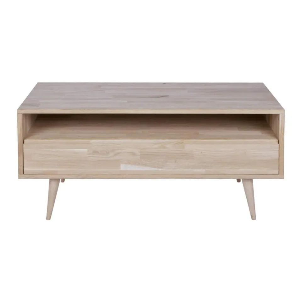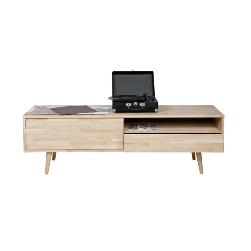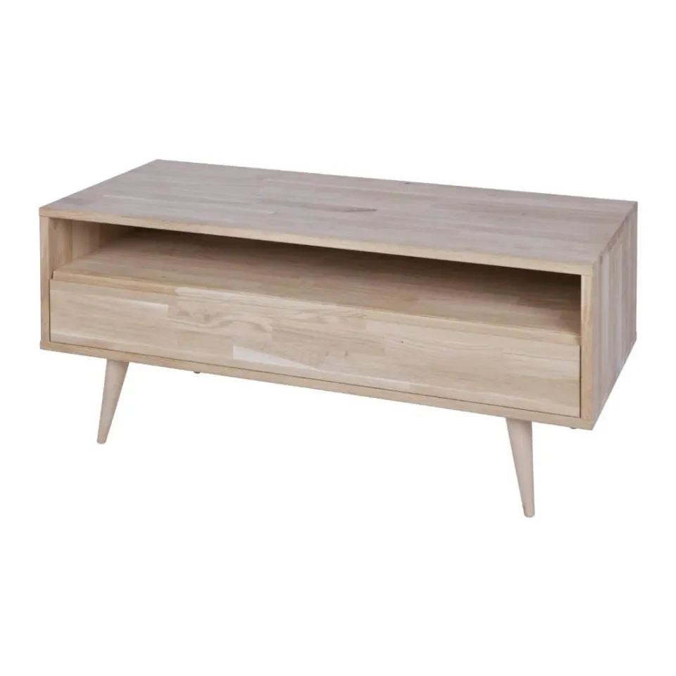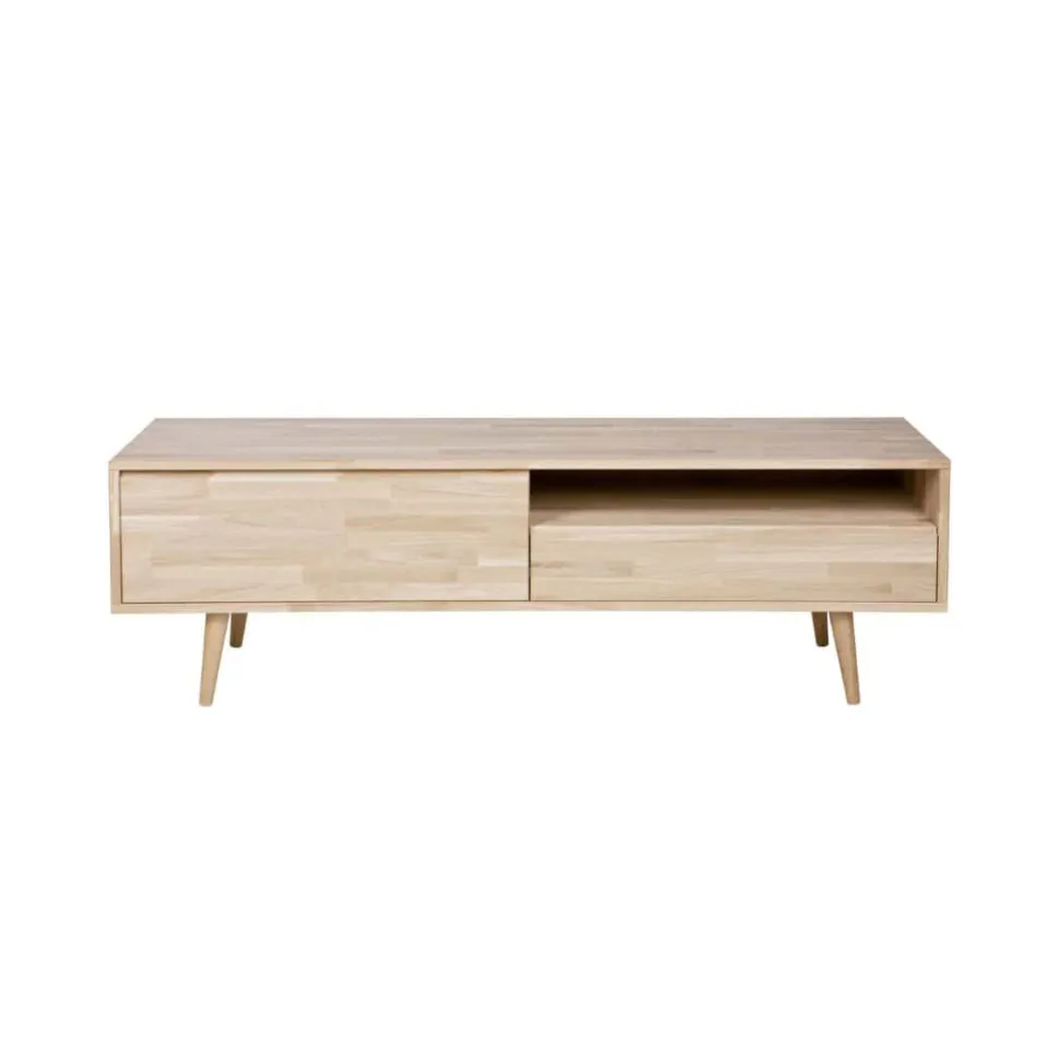 Tv-meubel Tygo van onbehandeld eiken is een basic. Deze retrostijl brengt een speciale eigentijdse jaren zestig sfeer in huis. Dit wandmeubel is uitgevoerd met 1 lade en 1 open vak waar voldoende ruimte is om media apparatuur, DVD’s en CD’s op te bergen. En daarom is dit meubel voorzien van een gat in het onderblad (achter de lade) zodat de bedrading daar doorheen gelegd kan worden.