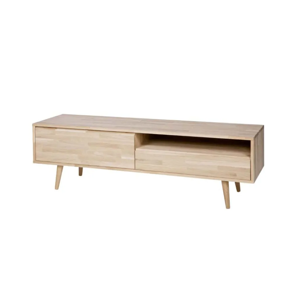 Een TV-audiomeubel dat heel veelzijdig is. De afmetingen van dit meubel zijn (bxhxd): 100x47x43 cm. Het onbehandeld eiken bestaat uit stroken verlijmd eikenhout. Ter bescherming van het meubel wordt geadviseerd het eiken te behandelen met meubelolie of lak. Het TV-audiomeubel is ook verkrijgbaar in de breedte 150 cm.