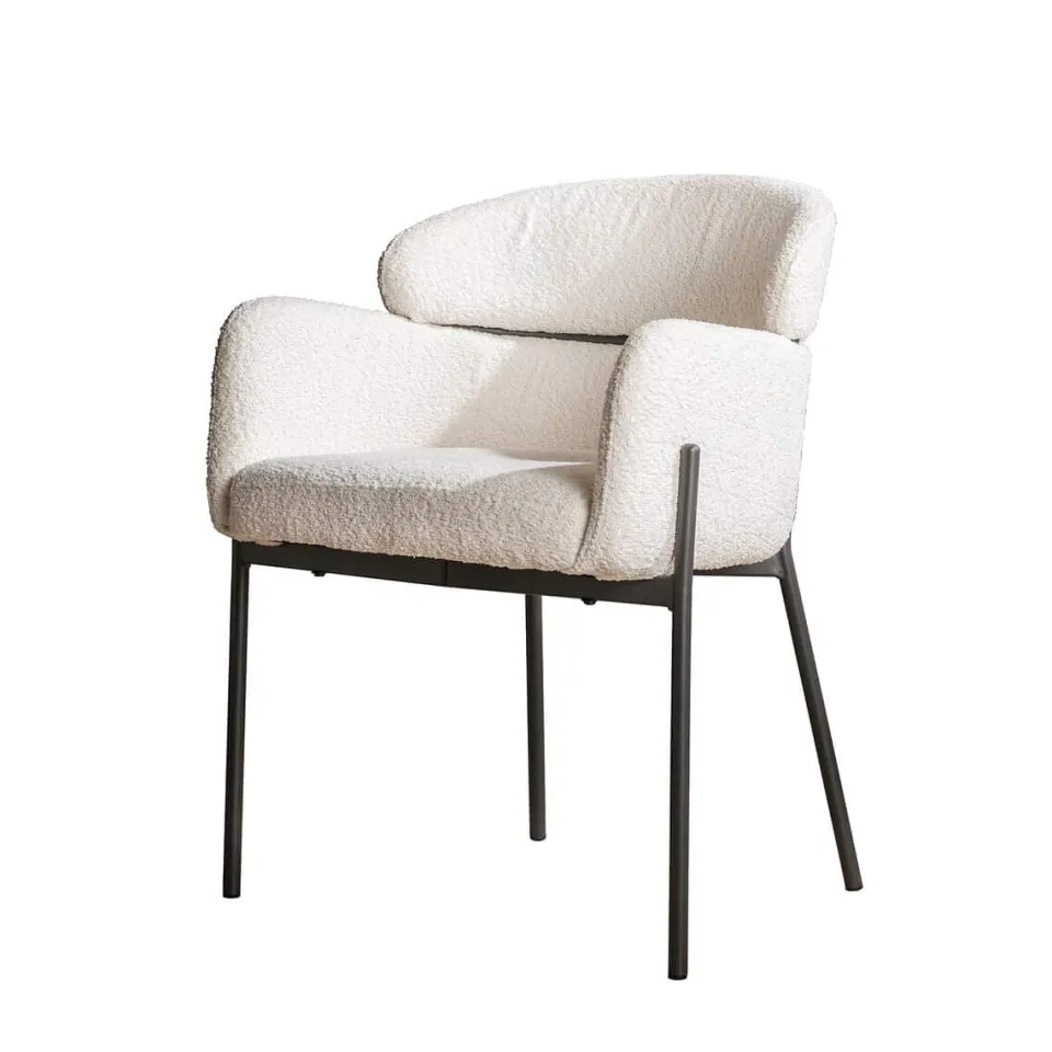 Eetkamerstoel Julliet is een comfortabele armstoel met een verfijnde, moderne uitstraling. De zitting is bekleed met zachte bouclé stof die warmte en textuur toevoegt aan je interieur. De afgeronde vormen van de rugleuning en armleuningen zorgen voor een prettige ondersteuning en een uitnodigende zit. Het zwarte metalen onderstel maakt het ontwerp compleet met een krachtig, stijlvol accent. Julliet is verkrijgbaar in meerdere kleuren.