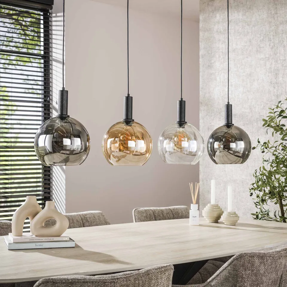 De hanglamp Sjors bestaat uit drie of vier bolvormige glazen kappen in chroom, amber en transparant. Het metalen armatuur en de plafondplaat zijn afgewerkt in een artic black finish. Iedere lamp is afzonderlijk in hoogte verstelbaar tot 150 cm.