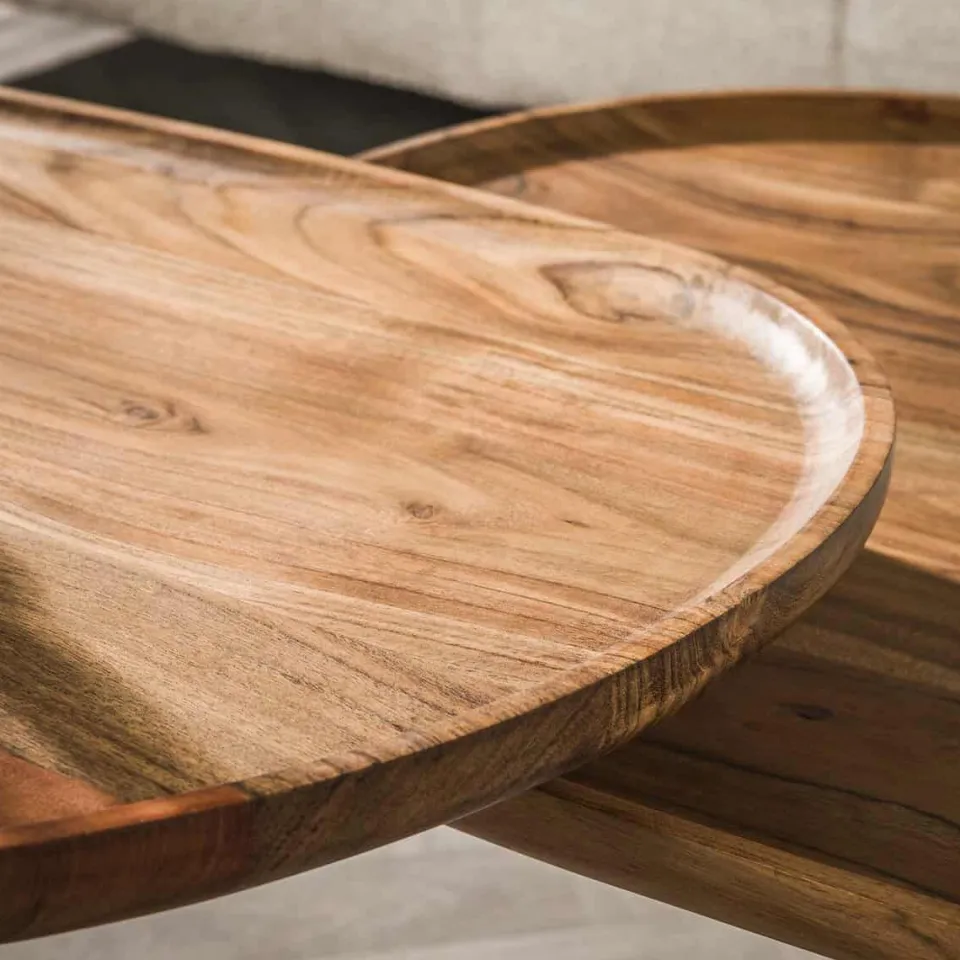 Deze prachtige salontafel set van 2 is uitgevoerd in massief acaciahout. Er is voor een organische gevormd blad met opstaande rand en een spider frame gekozen. Echt een eye-catcher! De grootste tafel heeft een oppervlakte van 70 bij 48 centimeter en een hoogte van 45 centimeter en de kleinere tafel heeft een oppervlakte van 57 bij 80 centimeter en een hoogte van 41 centimeter.