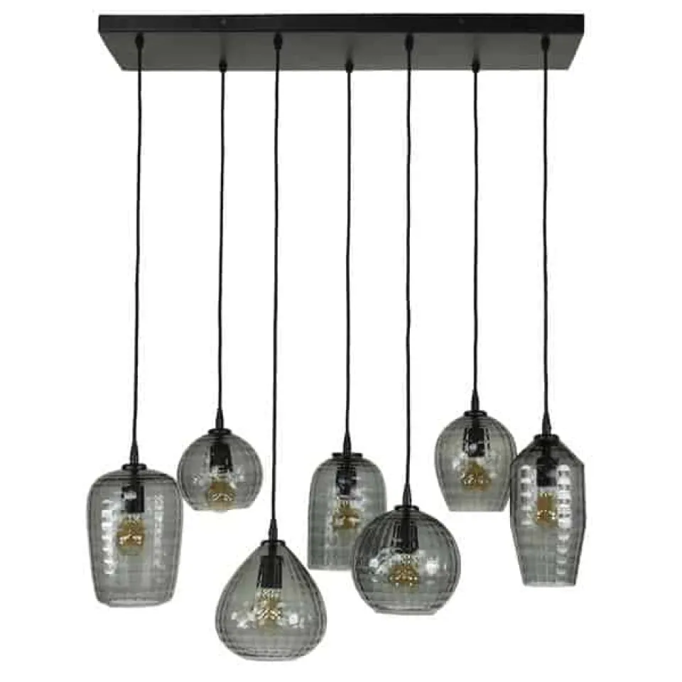 Deze eigentijdse hanglamp is een echte eye-catcher! De lamp is uitgevoerd in donker glas met 4 of 7 kapjes. Dankzij het donkere glas wordt de ruimte mooi en sfeervol verlicht. De kapjes zijn ieder tot 150 cm in hoogte verstelbaar en kunnen naar eigen inzicht speels opgehangen worden.