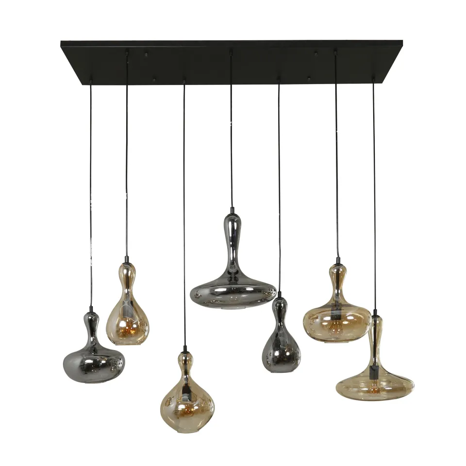 Deze prachtige hanglamp Parel is uitgevoerd met 7 glazen kappen. De kappen zijn uitgevoerd in 2 verschillende kleuren. Het armatuur is afgewerkt met een artic black finish. De kappen zijn afzonderlijk van elkaar tot 150 cm in hoogte verstelbaar.