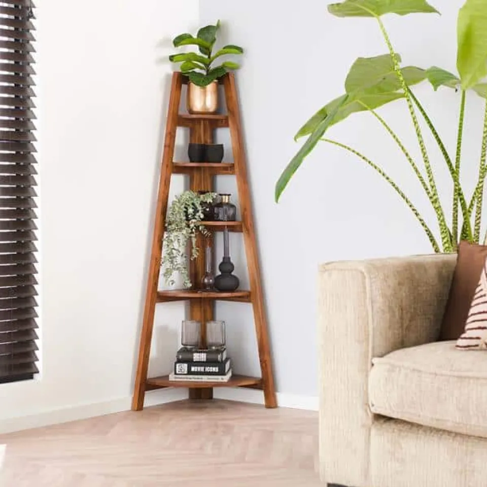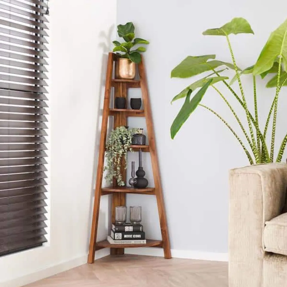 Dit hoekrek is uitgevoerd in mangohout. Het rek beschikt over 5 schapjes. De schapjes beschikken over scharnieren waardoor deze omhoog geklapt kunnen worden wanneer dit nodig mocht zijn. Hierdoor is de verpakking van dit artikel aanzienlijk gereduceerd. Zie hiervoor de foto.