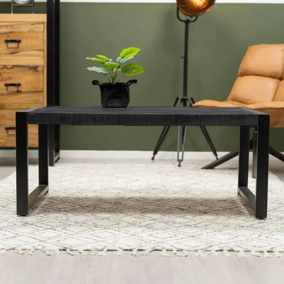Salontafel Britt zwart mangohout metaal HUUS collectie combineert stoer design met warme naturaliteit. Het massieve blad van mangohout is zwart afgewerkt en ondersteund door een stevig metalen frame. Daardoor krijgt deze tafel een krachtige uitstraling. Er zijn drie varianten: standaard, met lades of met extra planken — zodat jij kunt kiezen wat het beste past bij jouw interieur.