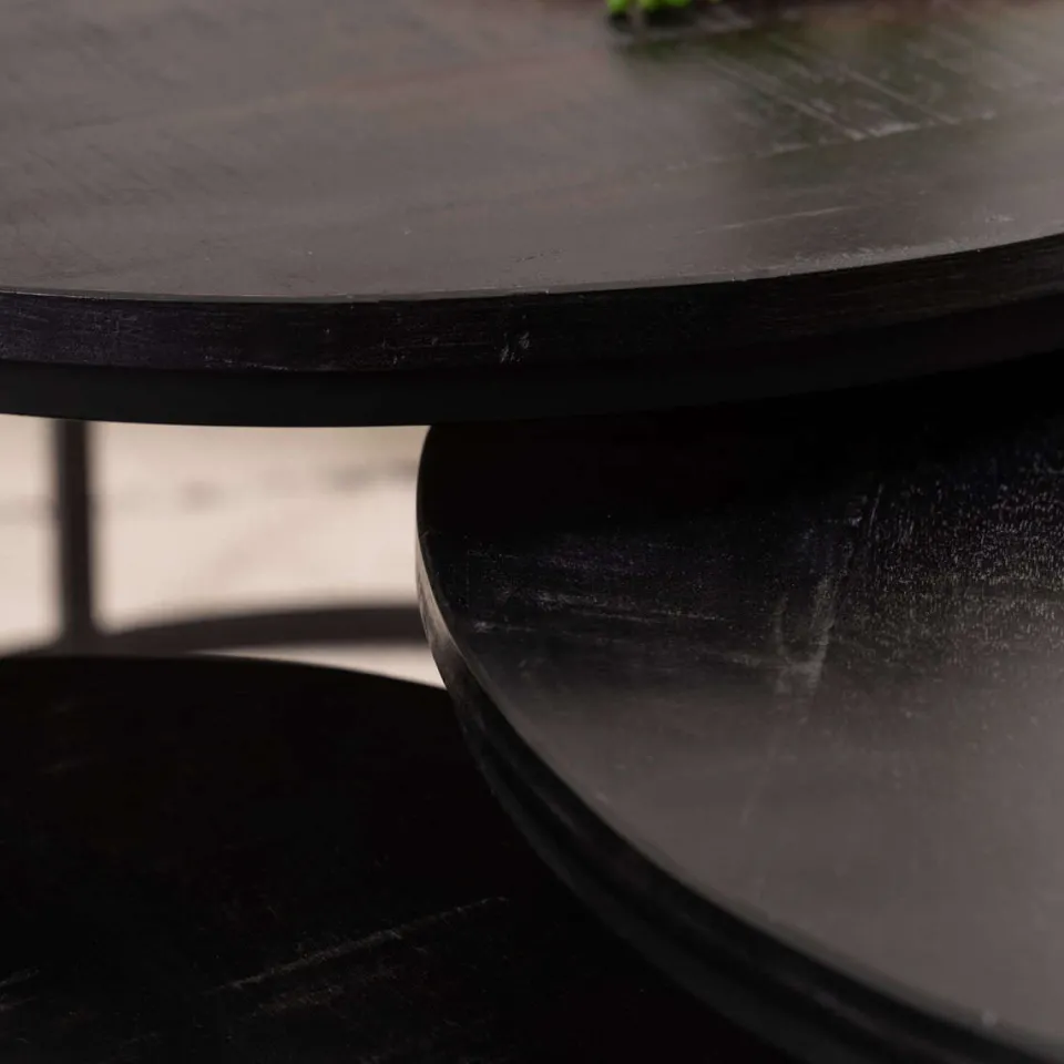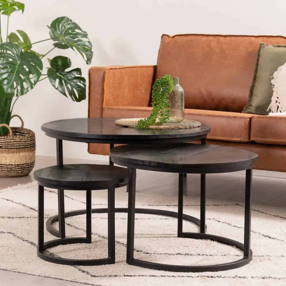 Salontafelset Apeldoorn van mangohout en metaal HUUS collectie brengt stijlvol design en praktische flexibiliteit samen in één elegante set. De set bestaat uit drie ronde tafels met warme, zwarte mangohouten bladen, ondersteund door verfijnde metalen cilinderpoten die zorgen voor een strak en industrieel accent. Deze combinatie maakt de set tot een moderne eyecatcher die zowel in grote als kleine woonkamers tot zijn recht komt.