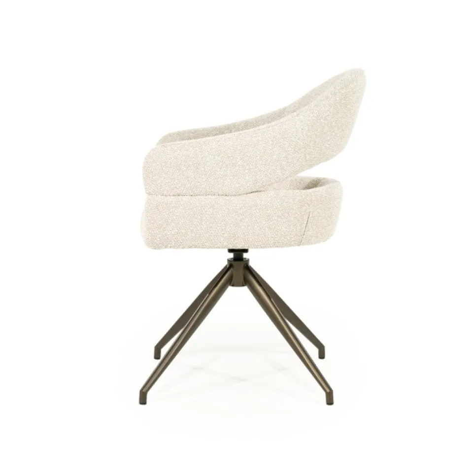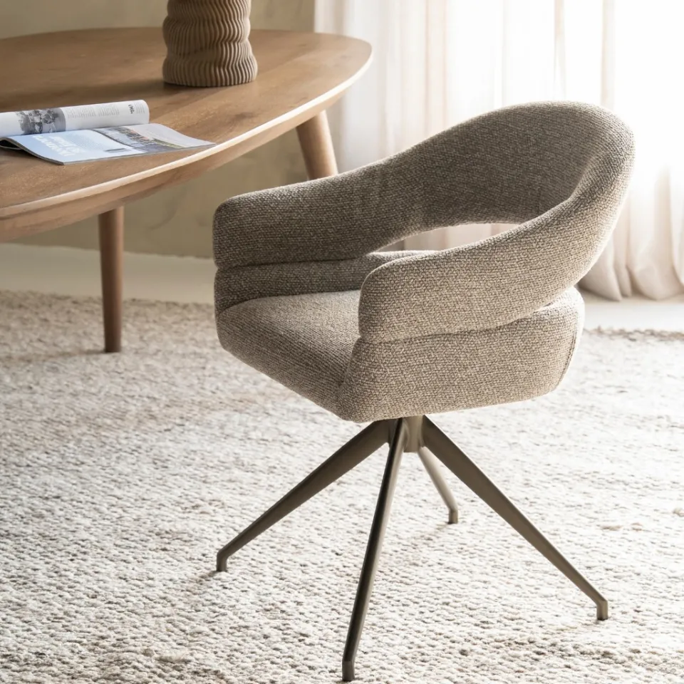 Eetkamerstoel Hailey combineert modern design met ultiem zitcomfort. De elegante ronde vorm en zachte bekleding geven de stoel een warme uitstraling, terwijl de 360 graden draaibare zitting zorgt voor extra gebruiksgemak. Verkrijgbaar in twee kleuren: taupe en beige. Hailey past moeiteloos in zowel klassieke als moderne eethoeken. De stevige, gecoate metalen poot zorgt voor een stabiele basis én een verfijnde afwerking.