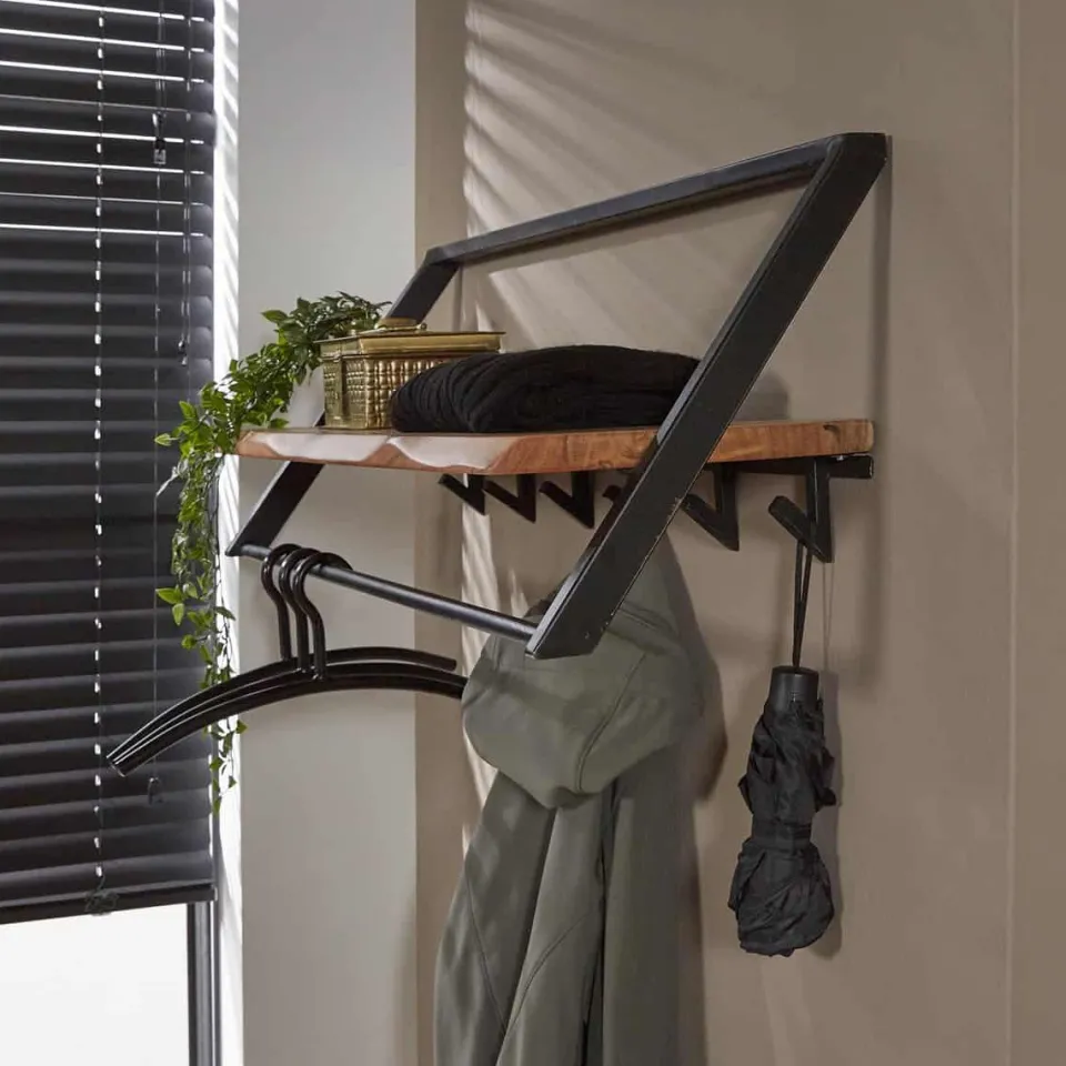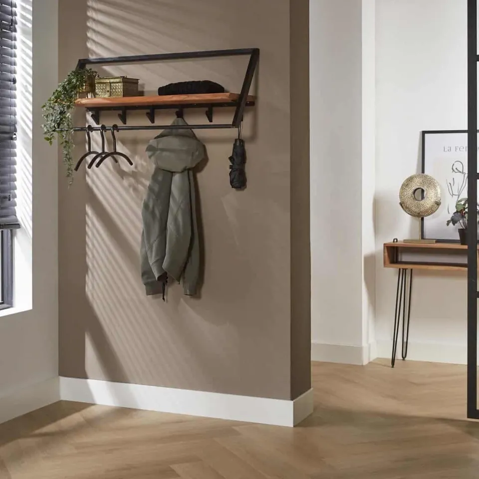 Deze trendy kapstok Alexis is uitgevoerd in acacia hout en gepoedercoat metaal. De kapstok kan door middel van 2 oogjes aan de muur gemonteerd worden.