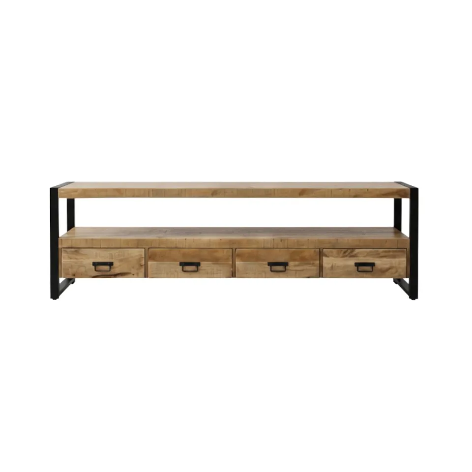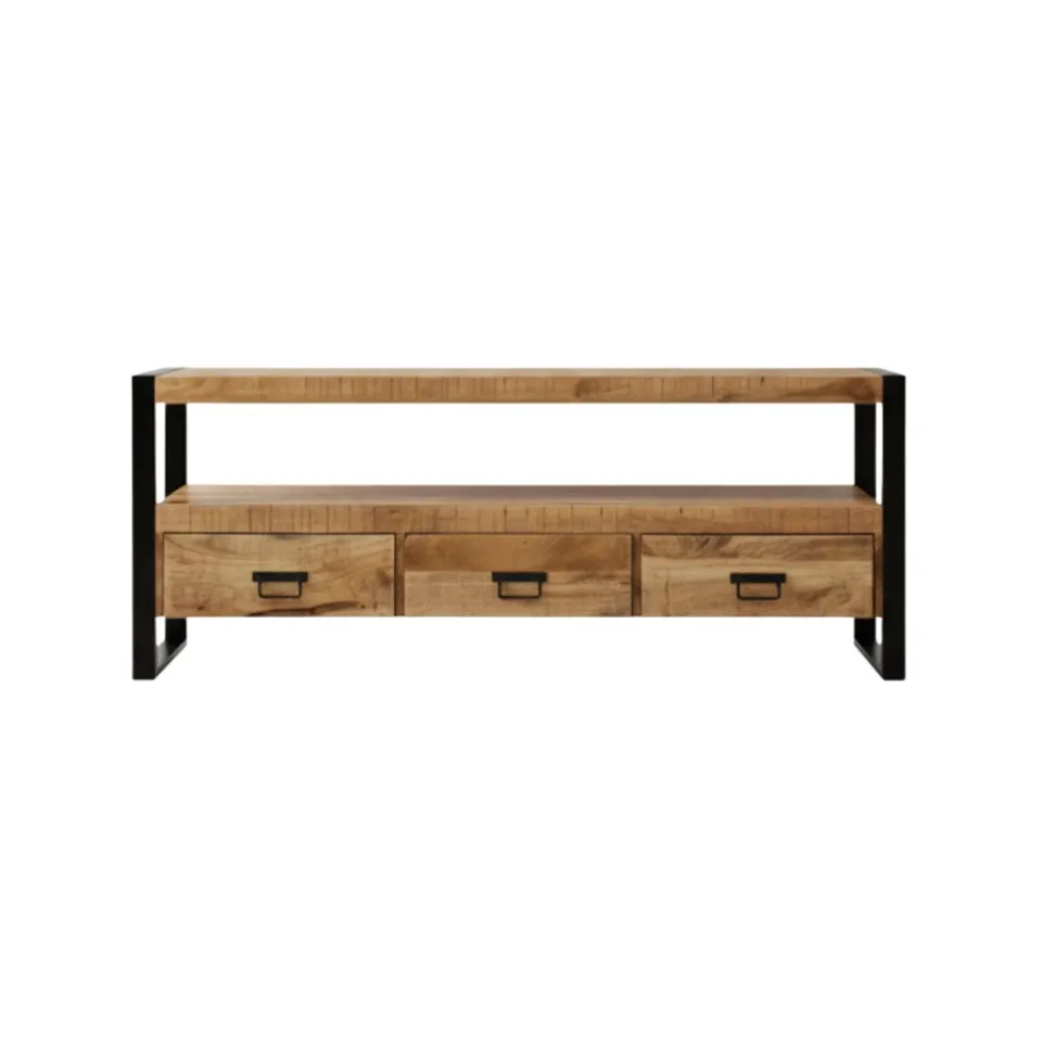 TV-meubel Britt is een meubel met een industriële uitstraling, gemaakt van mangohout in combinatie met robuust zwart metaal. Verkrijgbaar in drie formaten: met 2, 3 of 4 lades biedt Britt volop opbergruimte voor je apparatuur, afstandsbedieningen en andere woonaccessoires. Dankzij het tijdloze ontwerp past dit tv-meubel moeiteloos in moderne, industriële en zelfs landelijke interieurs. De lades zijn ruim en praktisch ingedeeld, waardoor je jouw woonkamer eenvoudig netjes en georganiseerd houdt. Britt is onderdeel van de meubelserie Britt, waardoor je het perfect kunt combineren met andere meubels voor een consistent geheel.