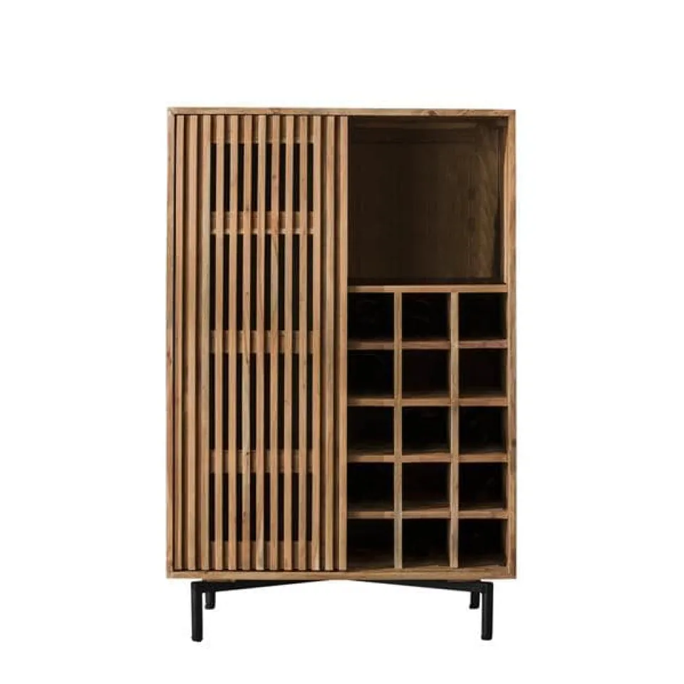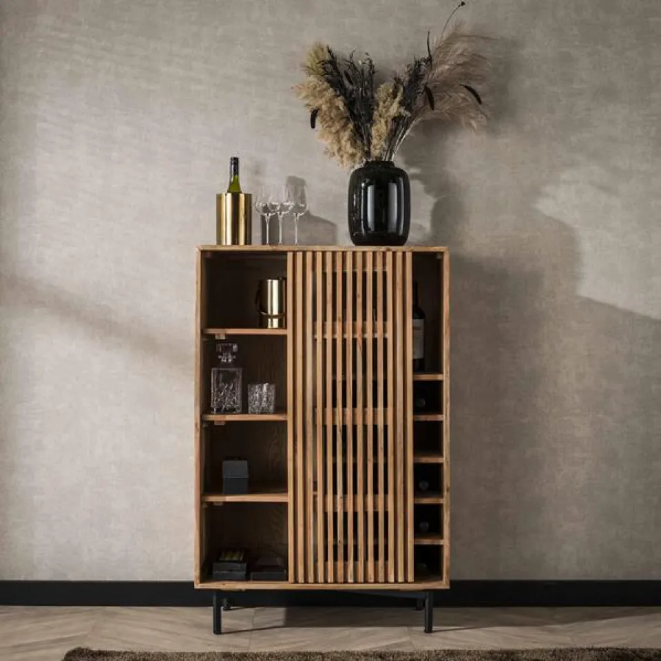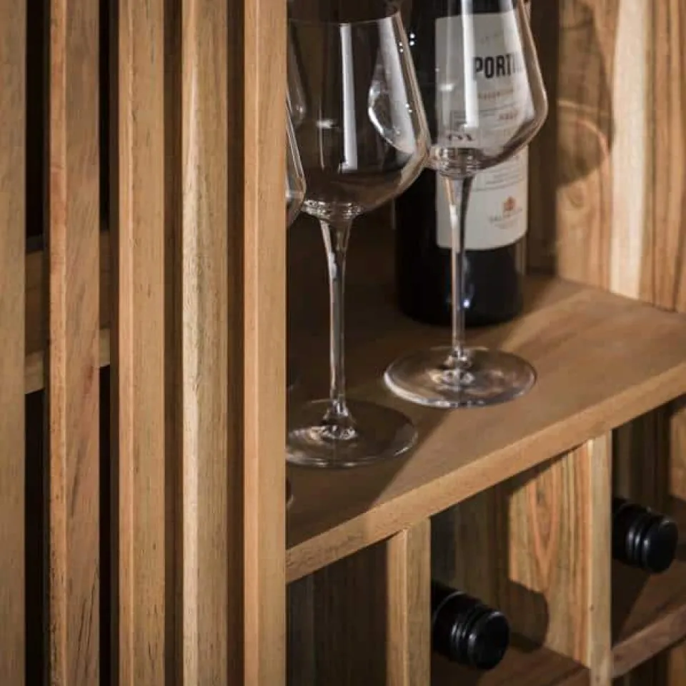 Deze wijnkast is uitgevoerd in acaciahout. De wijnkast beschikt over 1 schuifdeur, deze kan zowel voor de linker als voor de rechter kant geschoven worden. De wijnkast heeft 15 wijnvlakken en aan de andere zijde 3 schappen. De wijnkast heeft een speelse en eigentijdse uitstraling verkregen doordat er is gekozen voor latjes.
