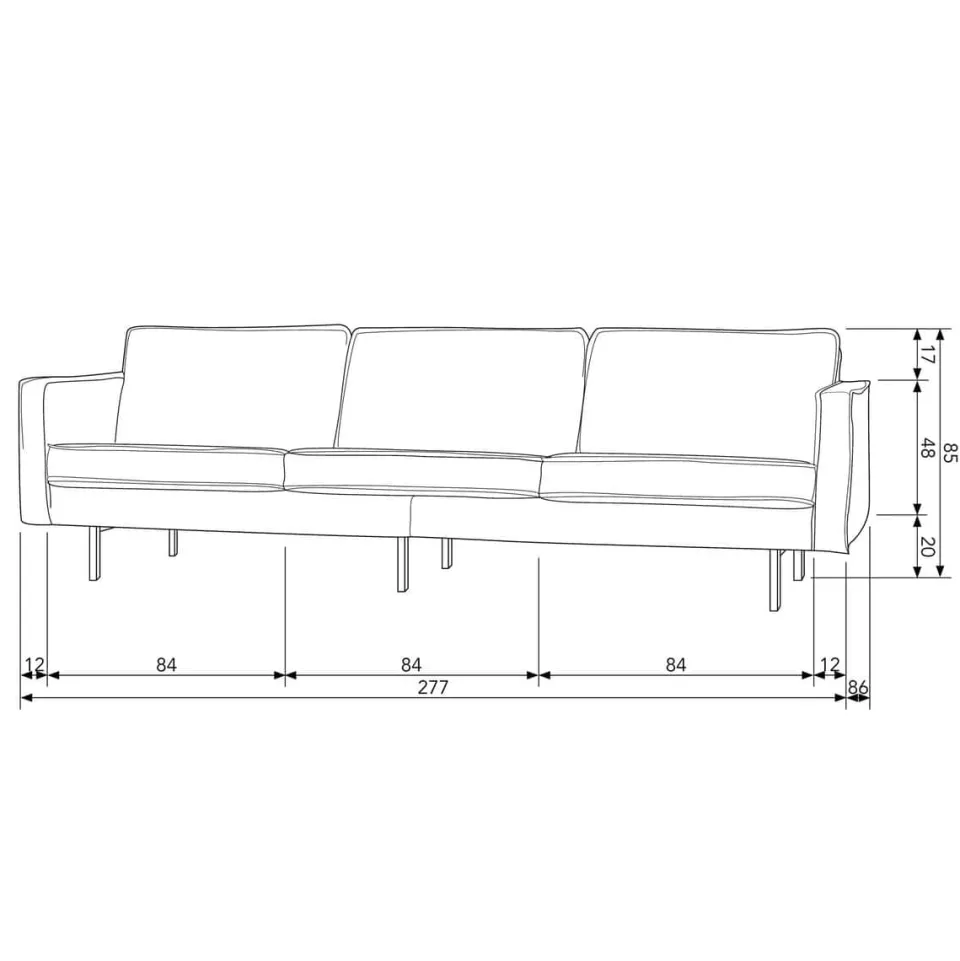 De drie losse zit- en rugkussens dragen bij aan een aangename zitervaring en geven de bank een ontspannen uitstraling. De zwarte metalen poten zorgen bovendien voor een moderne, luchtige look en maken het ontwerp helemaal van nu. Zo is deze bank niet alleen comfortabel, maar ook stijlvol en praktisch.