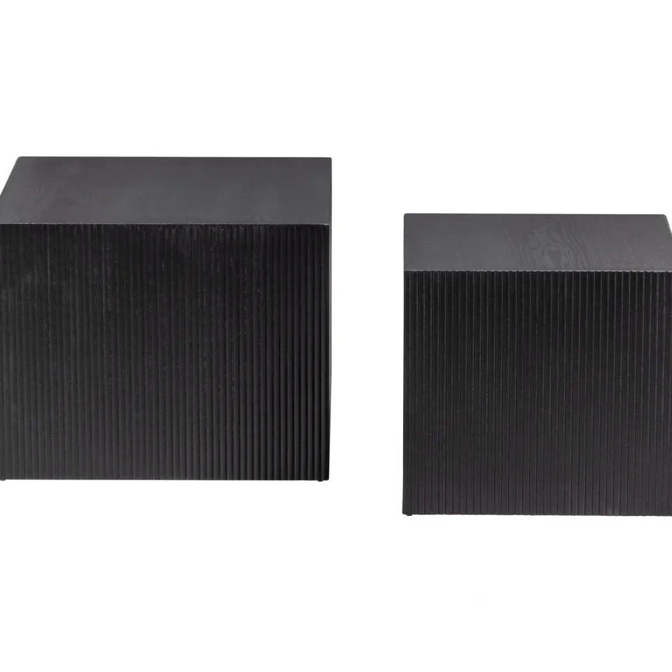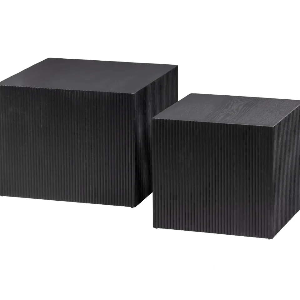 De grootste van de twee heeft het formaat (hxbxd) 40x50x50 cm, de kleinere variant is (hxbxd) 37x40x40 cm. Beide tafeltjes zijn gemaakt van grenenhout MDF in een matzwarte lak. De onderzijde van de tafels is open, de dikte van het hout is 1 cm. De grote versie weegt 7,5 KG, de kleine 4,3 KG. Beide Sanne tafels kunnen elk 20 KG dragen.