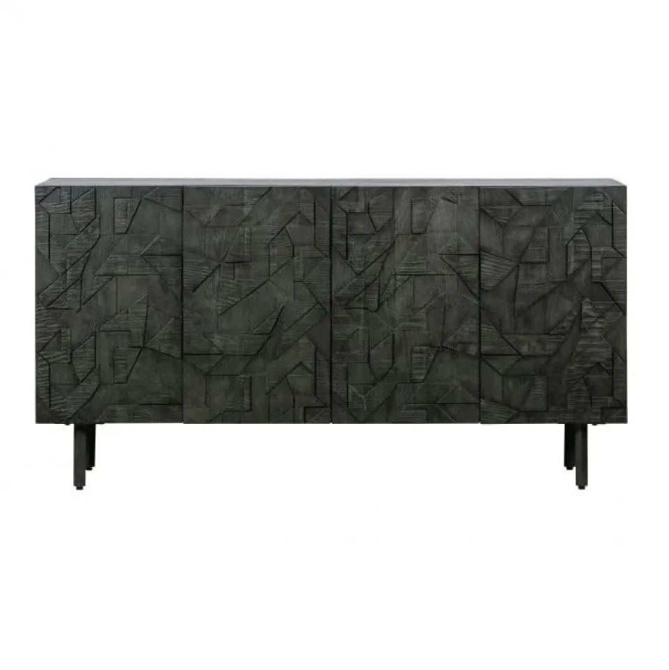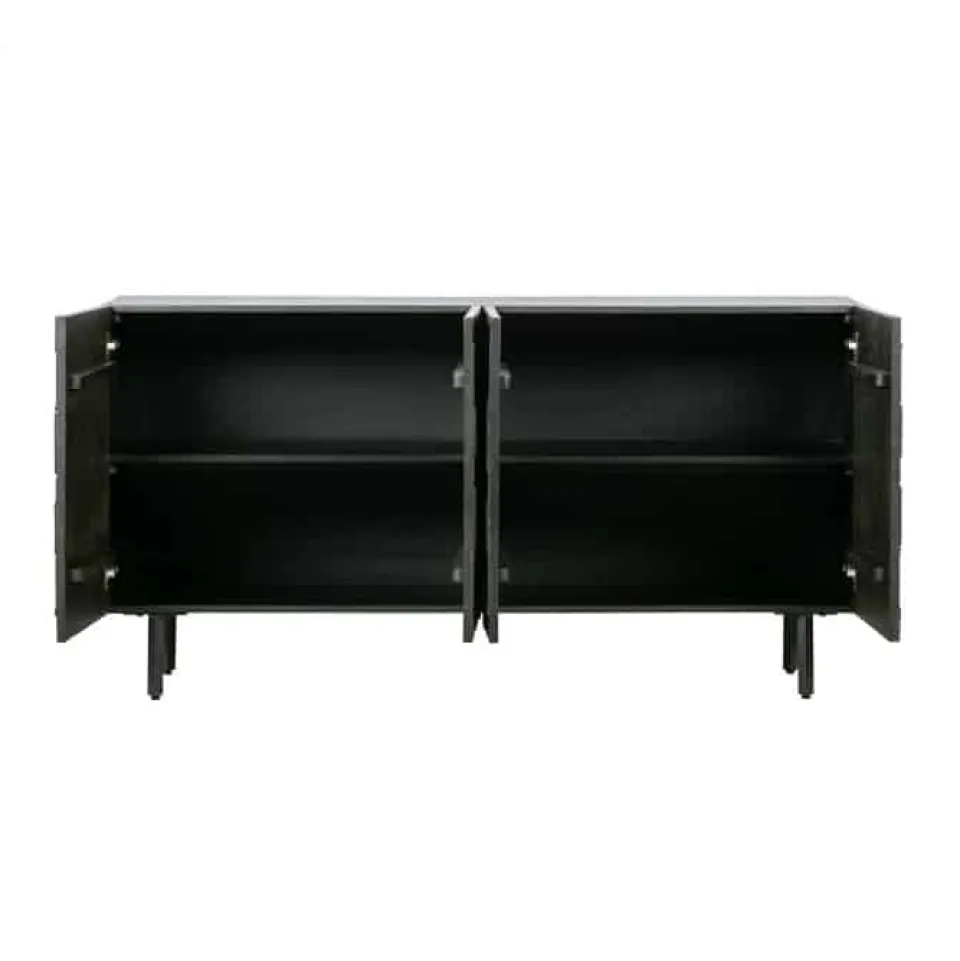 Het dressoir heeft een totale hoogte van 83 cm, is 160 cm breed en 40 cm diep. De metalen poten hebben een hoogte van 18 cm. Het metalen frame is 2×2 cm dik. De vier deuren met houtsnijwerk zijn 65 cm hoog, 39,5 cm breed en 2 cm dik. De deurtjes beschikken over een softclose systeem. De inhoud van de kast is in twee grote vakken verdeeld met elk een 78 cm brede legplank. Deze legplank heeft een diepte van 33,5 cm, aan de achterzijde is een kier van 1,5 cm dus kleine items kunnen op de onderste plank belanden. De open vakken hebben in een inhoud van (hxbxd) 30x78x35 cm.