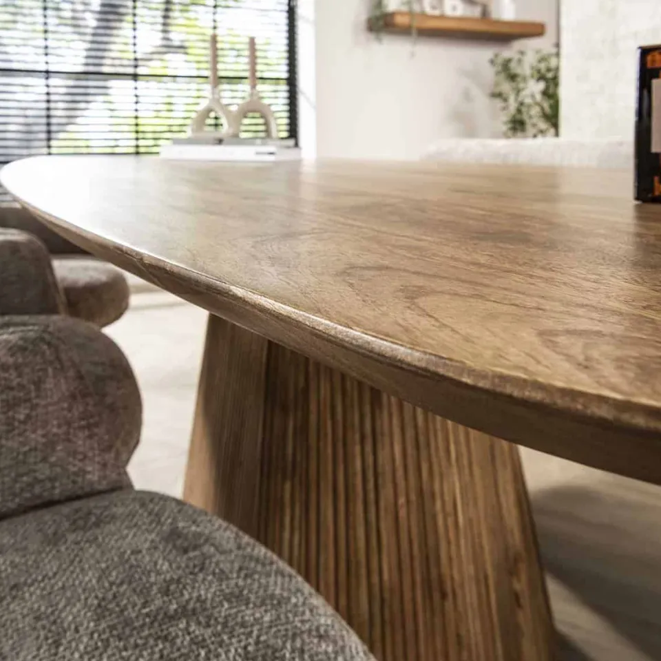 De eettafel Savine heeft een mangohouten blad met een verjongde rand en een centrale poot met een uniek wave patroon. Het tafelblad en de poot hebben beide een zandkleurige matte finish, wat zorgt voor een natuurlijke en warme uitstraling. De eettafel is geschikt voor 6 tot 8 stoelen.