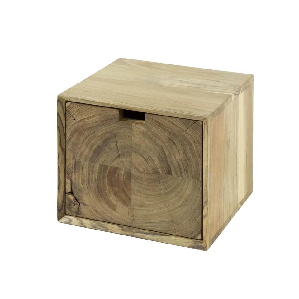 Het zwevende nachtkastje Blok is vervaardigd uit massief acaciahout en afgewerkt met een matte, transparante lak die de natuurlijke houtstructuur mooi benadrukt. Het kastje heeft één lade met een opvallend front in de vorm van een boomdoorsnede. Montage aan de muur is eenvoudig met twee stevige beugels, hierdoor lijkt het te zweven en blijft de vloer vrij.
