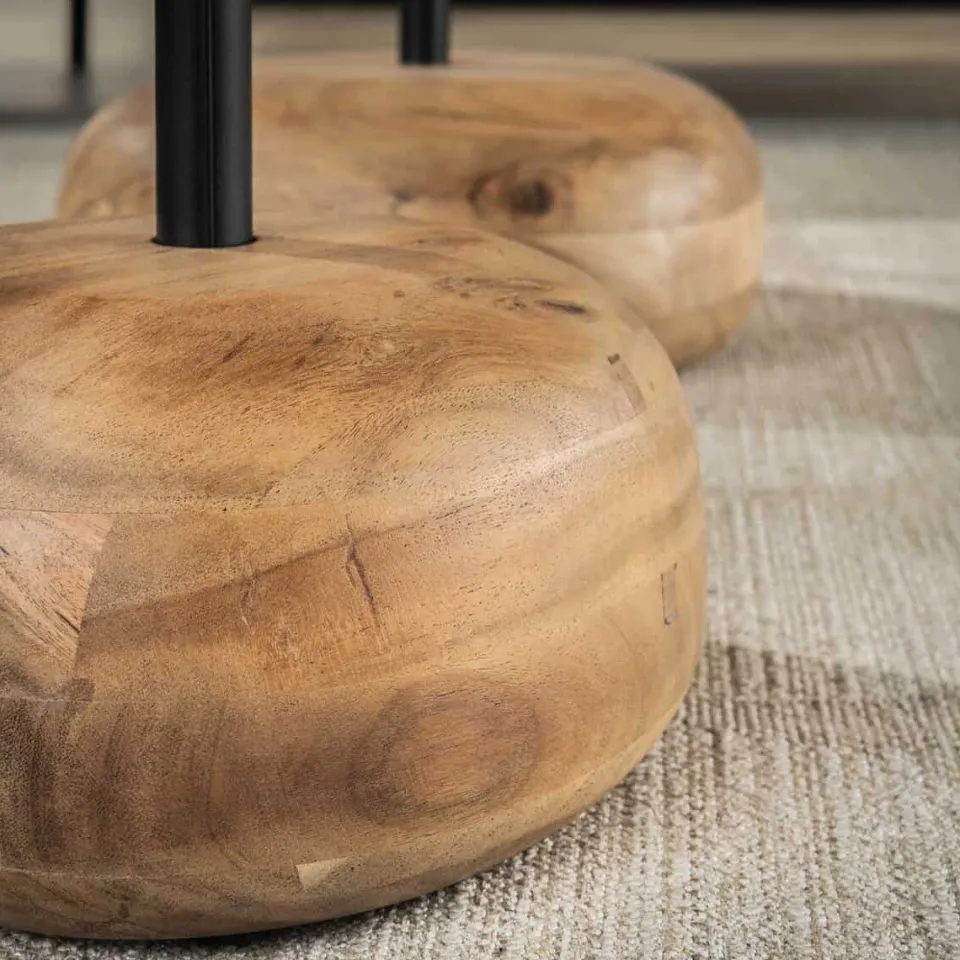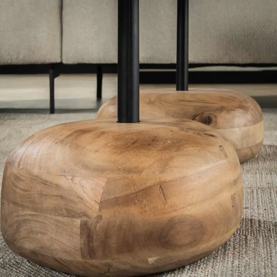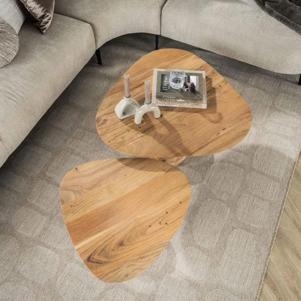 Deze salontafel set van 2 is uitgevoerd in massief acacia hout. Het tafelblad is vlak en de voet van de tafel heeft een massieve organische uitvoering. Het blad wordt door middel van een schroefdraad aan de voet gemonteerd.