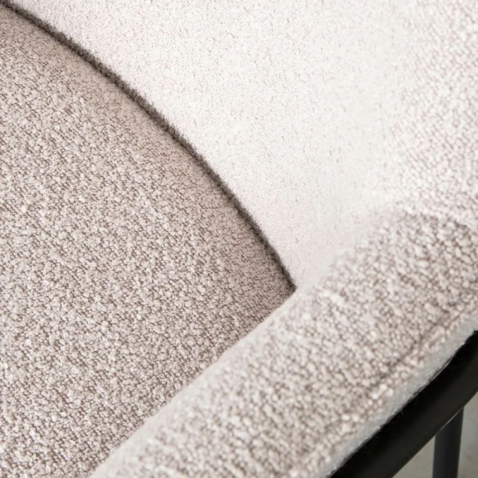 Dexter, uitgevoerd in naturel boucle heeft een ronde, robuuste zitting voorzien van elegante rondingen en armleuningen. De mooie ‘curve’ van de zitting naar de arm- en rugleuning geeft deze stoel ontzettend veel charme en comfort. De combinatie van de robuuste en grove zitting en het subtiele zwarte frame maakt deze stoel tot een extra uniek exemplaar. De zitting lijkt bijna te zweven tussen het frame!