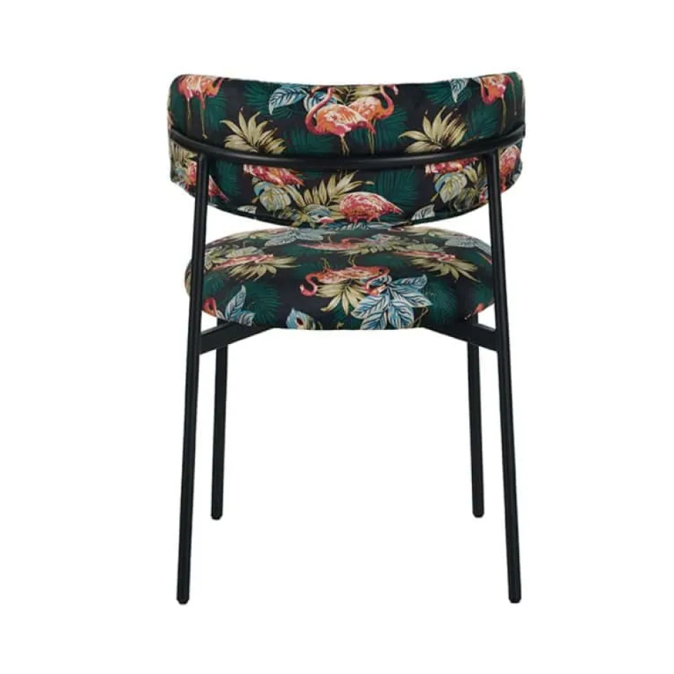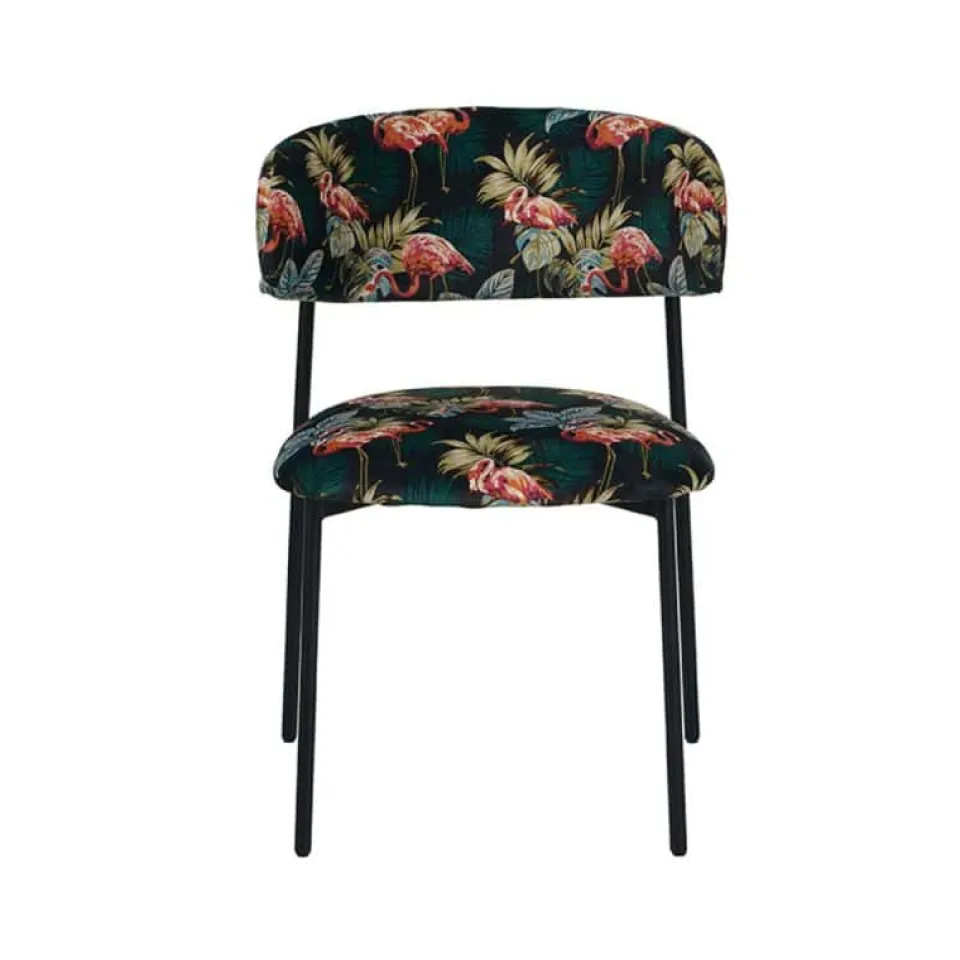 – Eetkamerstoel Ferry is voorzien van een hip en kleurrijk flamingoprintje.