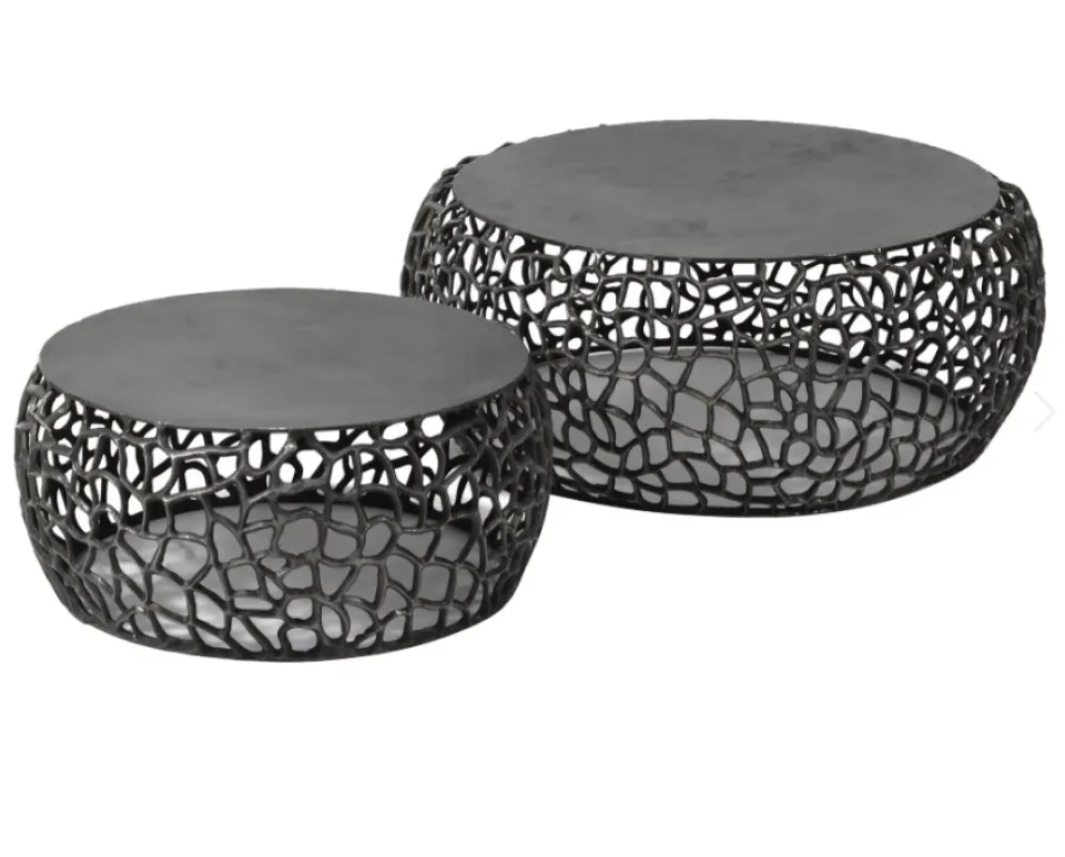 Deze salontafel bestaat uit een set van 2. Beide tafels zijn voorzien van een zandgegoten dun bovenblad van zwart nikkel. Het decoratieve onderstel is uitgevoerd in aluminium en geeft de salontafels een speels uiterlijk. Samen en apart te combineren