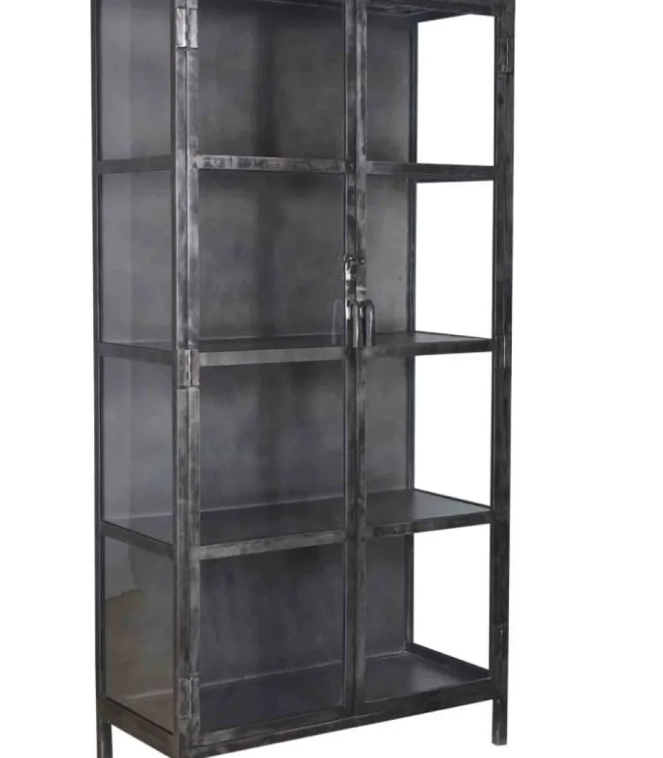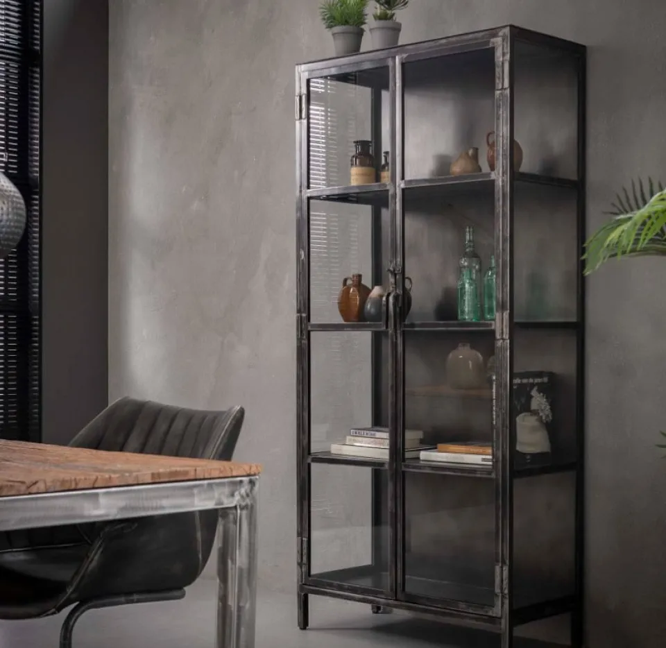 De vitrinekast is voorzien van 2 glazen deuren en 3 schappen. Vitrinekast Danny metal wordt opgebouwd geleverd.