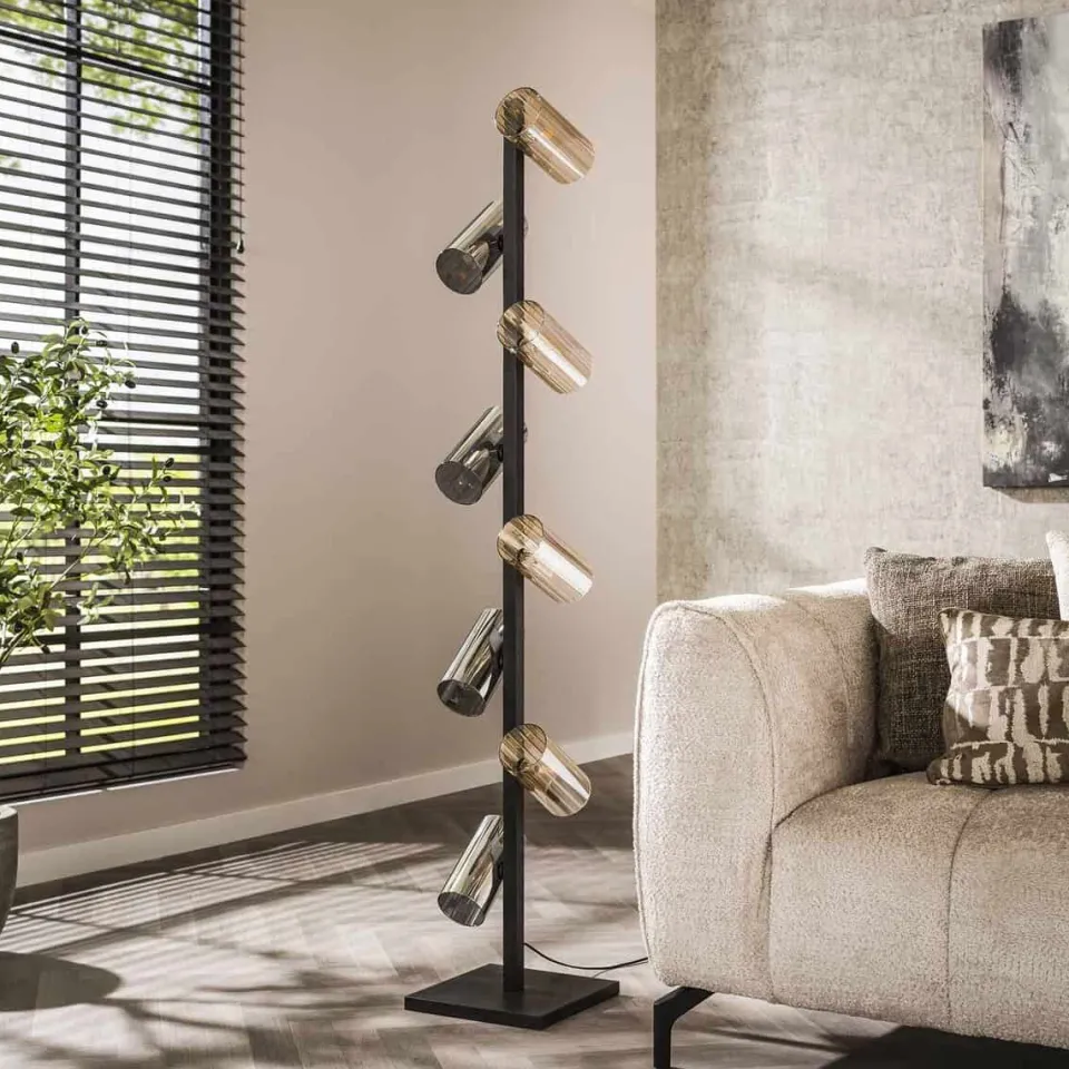 Deze prachtige vloerlamp Vinny is uitgevoerd met 8 glazen kapjes. De kapjes zijn afgewerkt in amberkleurig en chrome kleurig glas. De kapjes kunnen naar eigen inzicht gedraaid worden. De metalen delen van de lamp zijn afgewerkt in een artic black finish. Deze lamp heeft ook nog 2 bijpassende hanglampen.
