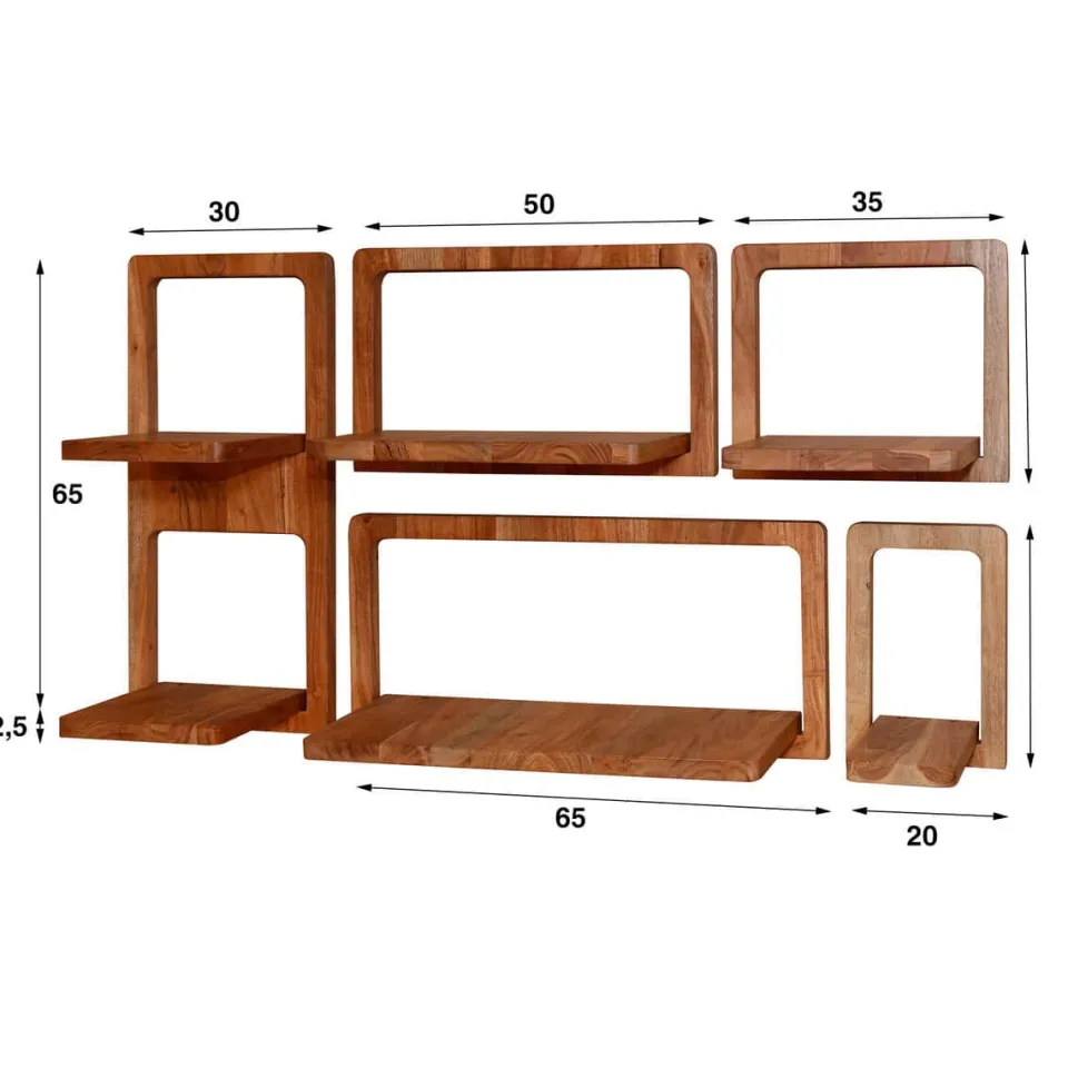 Wandschap Tyrone is een set van 5 wandplanken, gemaakt van massief acaciahout en afgewerkt met een matte, transparante lak die de natuurlijke houtstructuur goed zichtbaar laat. De afgeronde hoeken geven de planken een verfijnde uitstraling. Elke plank is voorzien van twee metalen oogjes voor eenvoudige wandmontage. De set kan op verschillende manieren worden geplaatst, bijvoorbeeld als een rechthoekige compositie of in een vrije opstelling.