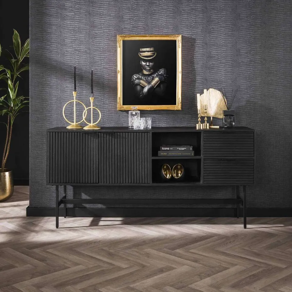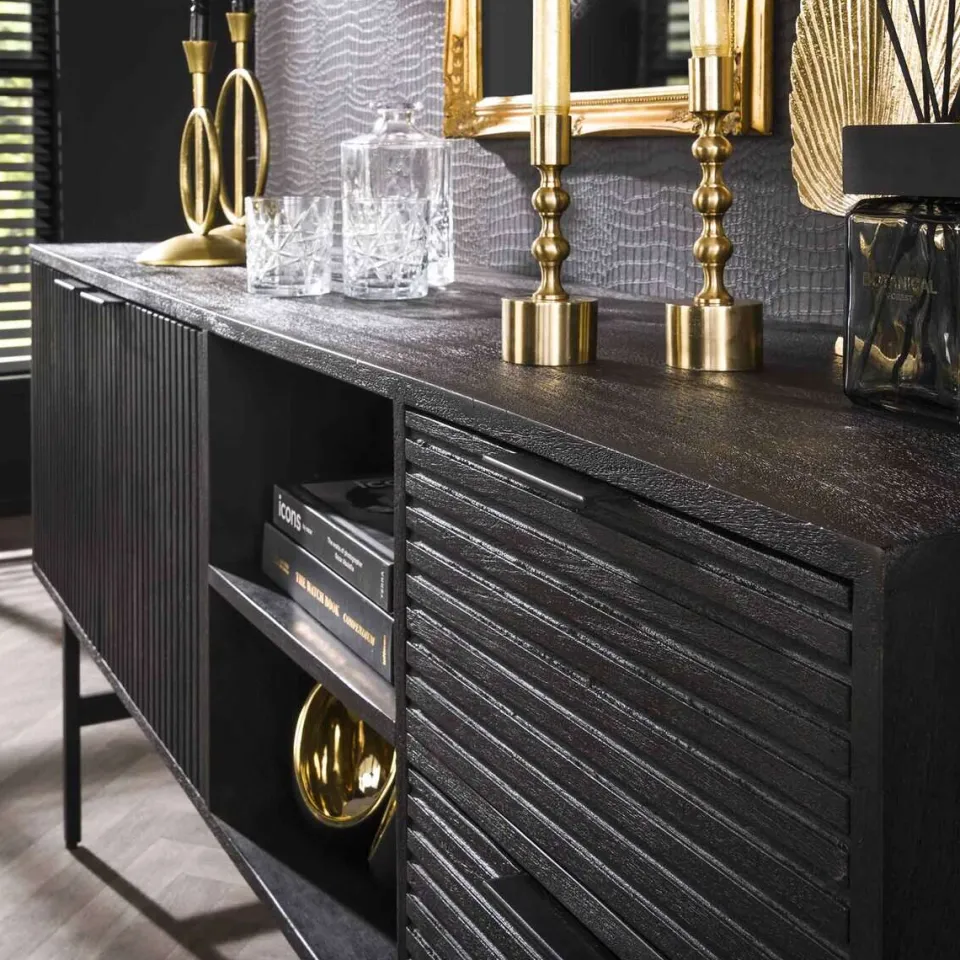 Dit dressoir Mario is uitgevoerd in mangohout met een zwarte finish. Het dressoir beschikt over 2 kastdeuren, een open vak met twee schappen en twee lades. Het mangohout is erg glad geschuurd, waardoor er een vlak oppervlakte is ontstaan.