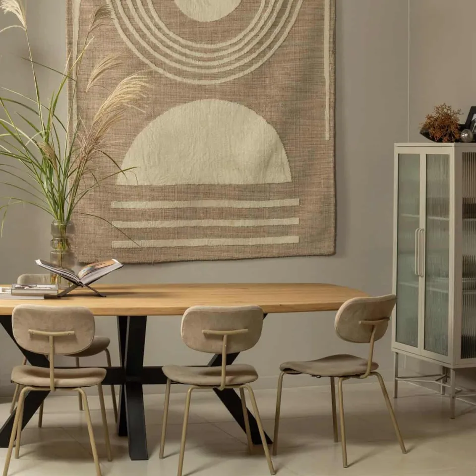 Eetkamerstoel Link van WOOOD Exclusive is een elegante stoel met een modern karakter. De kuipzitting is bekleed met een zachte, matglanzende ribstof uit de Ella-serie: een geweven stof met fluweelachtige grip en een speels banenpatroon. De subtiele kleurnuances en zichtbare diepte in de stof geven de stoel een rijke uitstraling. Het ranke metalen onderstel in bruin-grijze poedercoating maakt Link tot een stijlvolle en luchtige verschijning aan iedere eettafel.