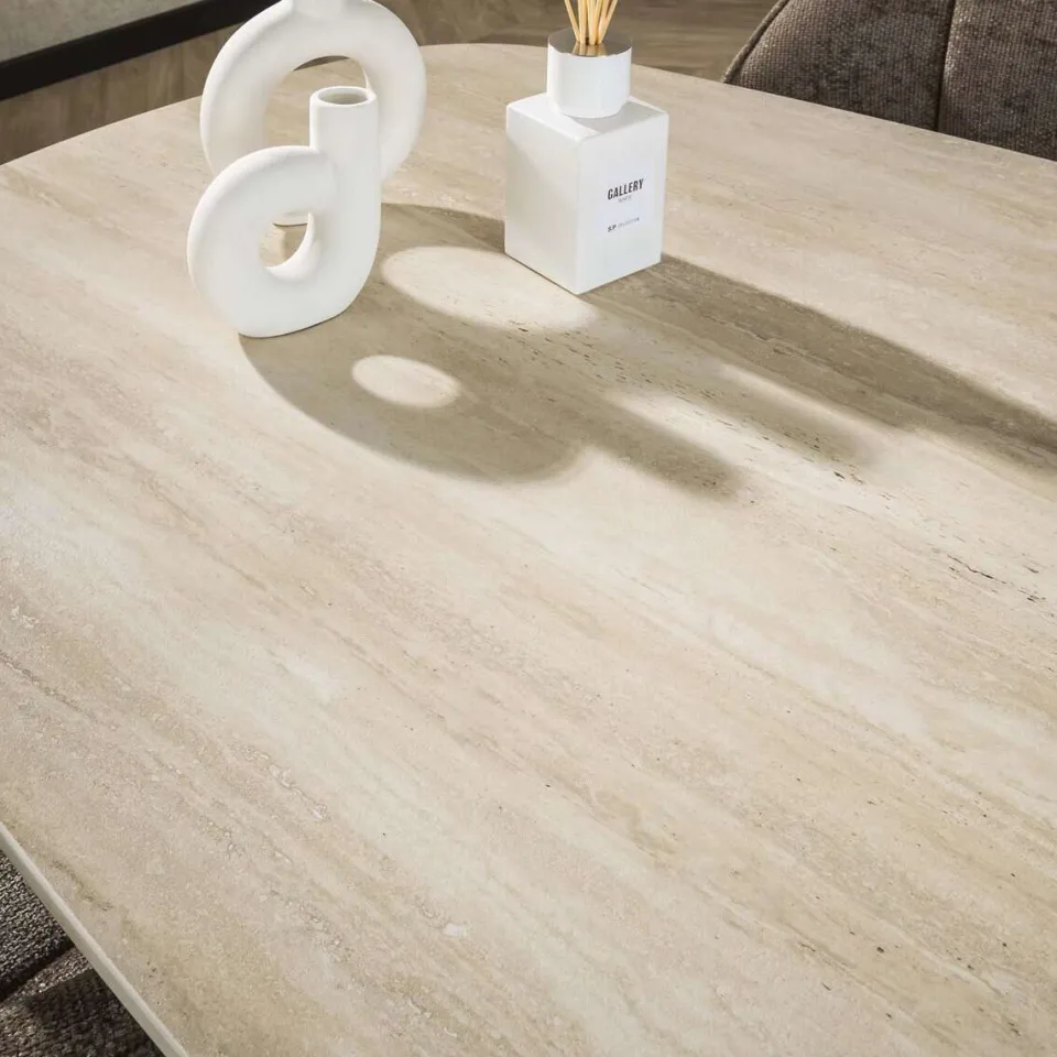 Eetkamertafel Fleur is een Deens ovale tafel van 180 of 215 cm breed, uitgevoerd in 3D-keramiek met een travertin-look. Dankzij het gebruik van 3D-keramiek wordt de natuurlijke uitstraling van travertin nog realistischer benaderd. Het blad rust op een stevig spiderframe en combineert esthetiek met functionaliteit.
