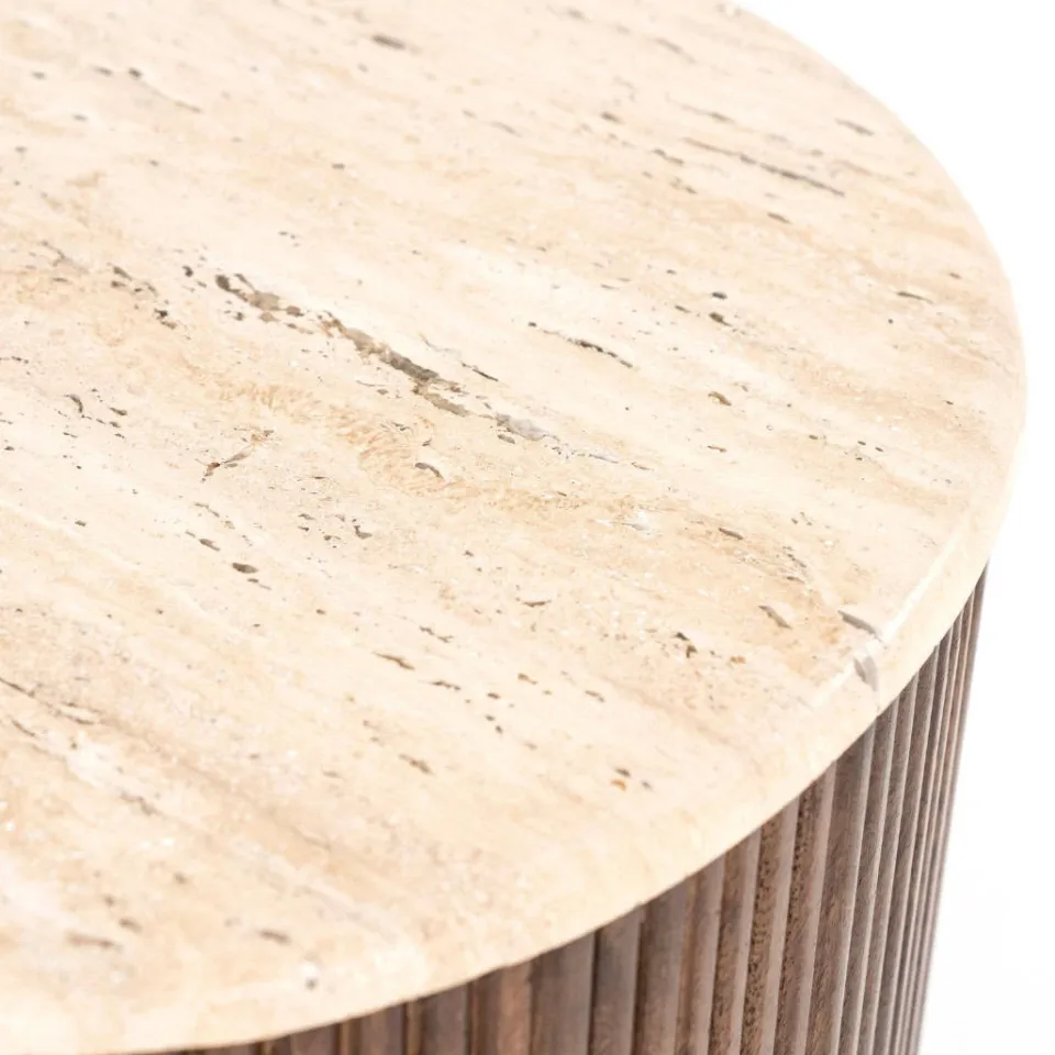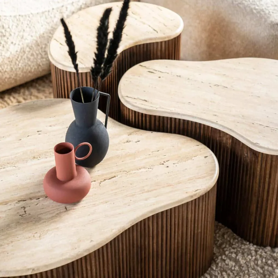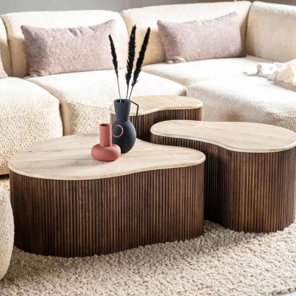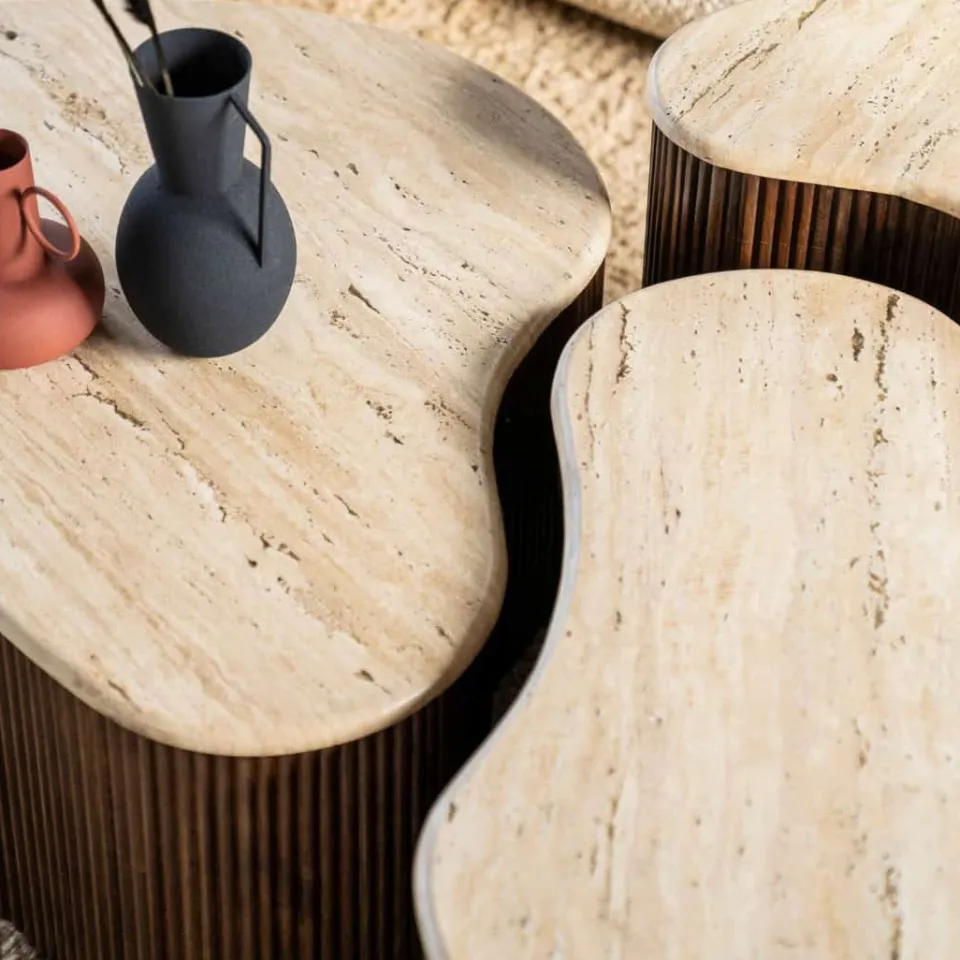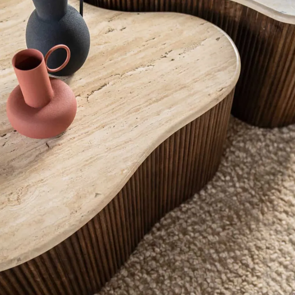 De tafeltjes Mari, met zijn organische vormen, trekken direct de aandacht in je interieur. Het tafelblad, vervaardigd uit het prachtige natuursteen travertin, rust op een onderstel van mangohouten latjes. De unieke combinatie van deze natuurlijke materialen in een bijzondere vorm maakt de salontafelset tot een echt luxe pronkstuk in de woonkamer.