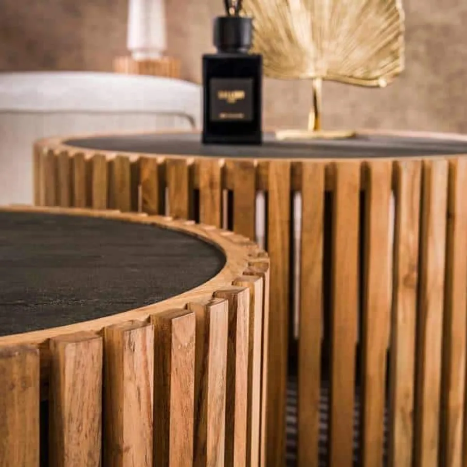 Deze ronde salontafel set van 2 ‘slate’ is uitgevoerd in leisteen met een acaciahouten frame. Het leisteen is met een dunne laag aangebracht, waardoor het haar prachtige uitstraling krijgt, maar ook nog een comfortabel gewicht houdt. Een tijdloze set passend voor ieder interieur! De grootste tafel heeft een diameter van 68 centimeter en een hoogte van 40 centimeter en de kleinere tafel heeft een diameter van 55 centimeter en een hoogte van 35 centimeter.