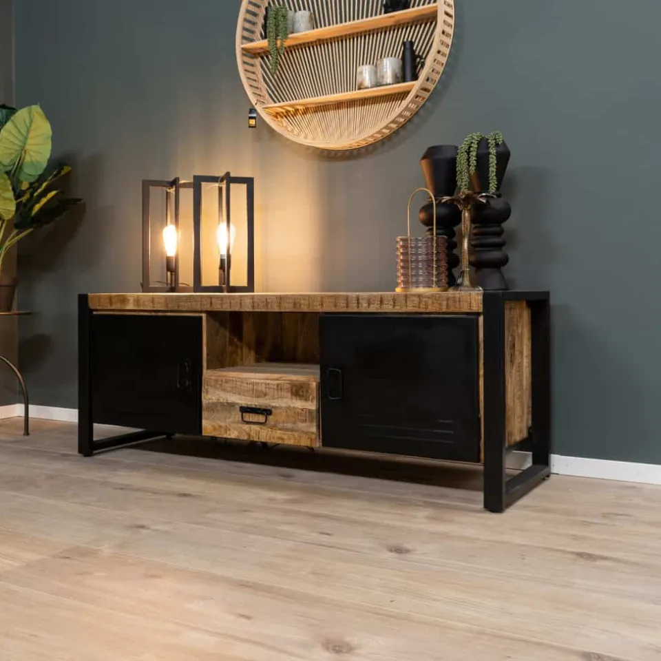 Tv-meubel Bas is een prachtige toevoeging aan je interieur, gemaakt van robuust mangohout en voorzien van ijzeren elementen die een industrieel karakter geven. Dit tv-meubel is beschikbaar in twee formaten: 150 cm en 200 cm breed, met een hoogte van 45 cm en een open ruimte onder de kast van 12,5 cm. Het biedt voldoende ruimte voor zowel je televisie als andere apparatuur, terwijl het tegelijkertijd een stoere en eigentijdse uitstraling biedt voor je woonkamer.