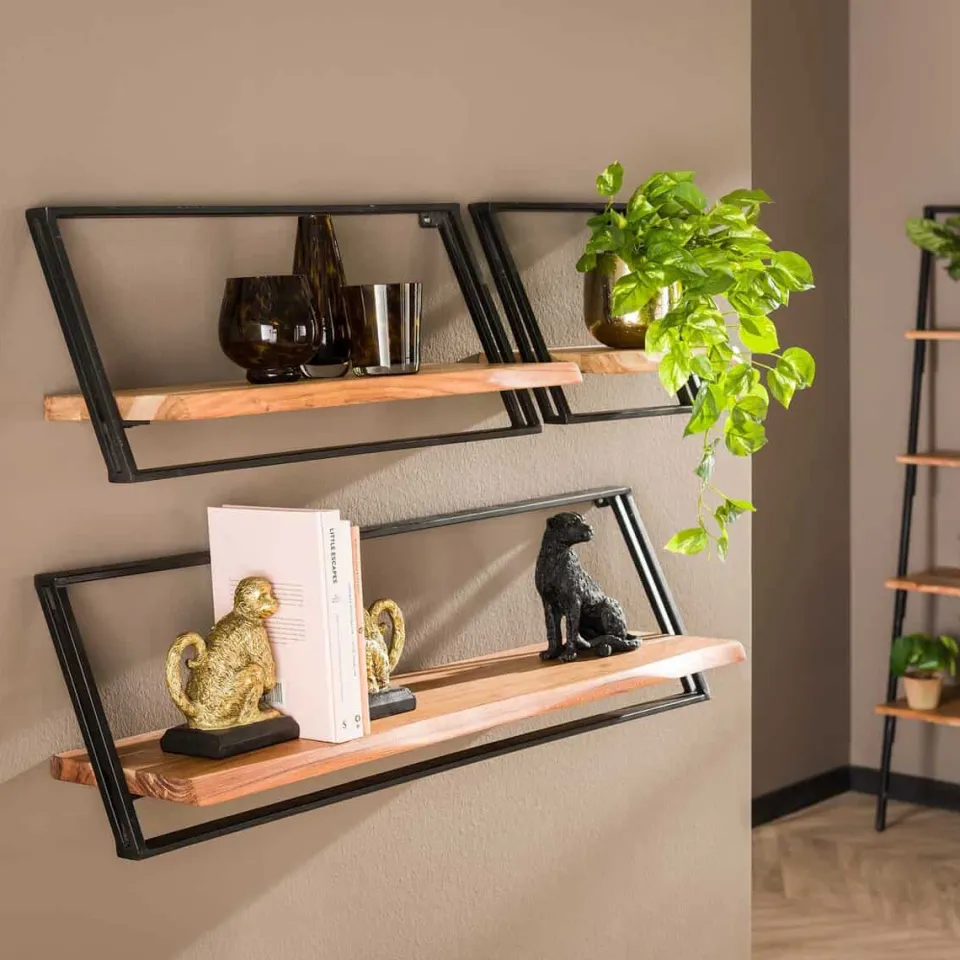 Deze Wandschapset Bobbi is uitgevoerd in acaciahout met een matte transparante lak en gepoedercoat metaal. De planken kunnen naar eigen smaak in diverse opstellingen worden opgehangen. Ze worden als set van drie geleverd en zijn elk met twee oogjes aan de muur te monteren.