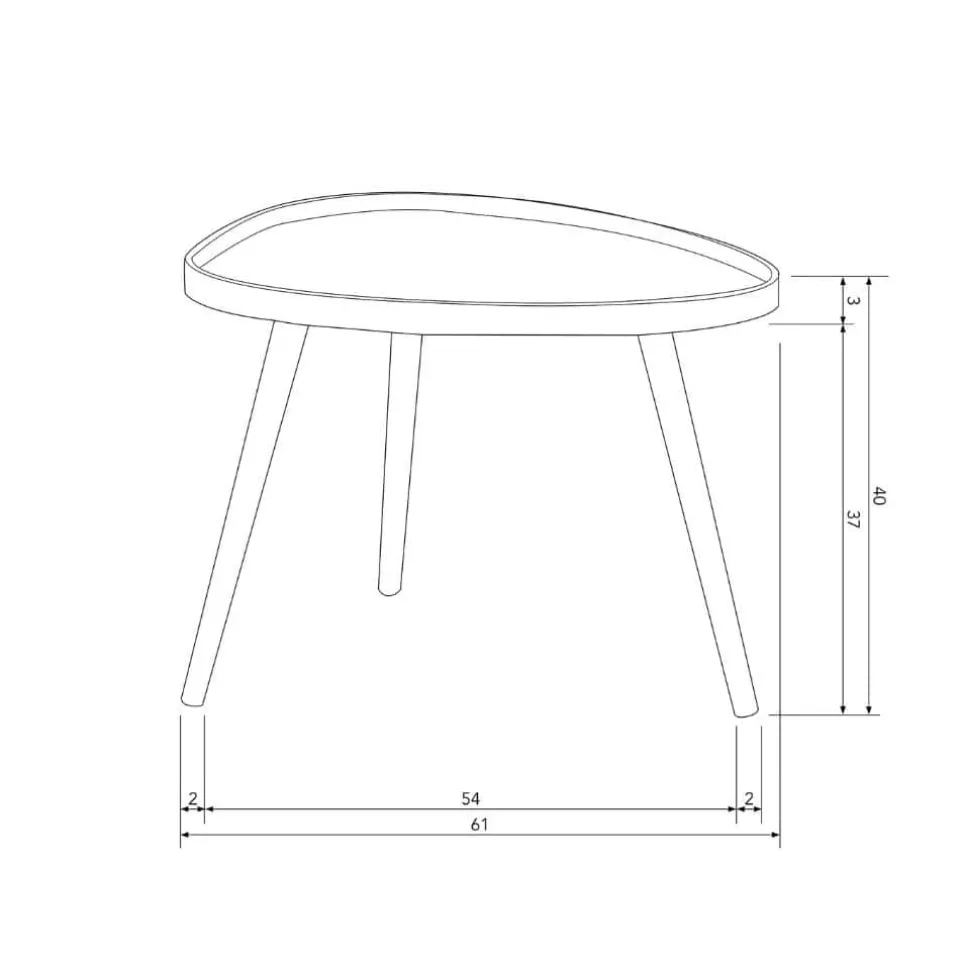 Deze slanke bijzettafel heeft een hoogte van 40 cm en is ongeveer 61 cm breed en 50 cm diep. Het tafelblad beschikt over een opstaande rand van 2 cm hoog. De poten hebben een hoogte van 37 cm en lopen van de bovenzijde ø 3 cm taps toe naar onderen tot ø 1,5 cm. De bijzettafel heeft een draagkracht van 10 kg wanneer gelijkmatig verdeeld. Het tafeltje weegt zelf een ruime 2 kg.