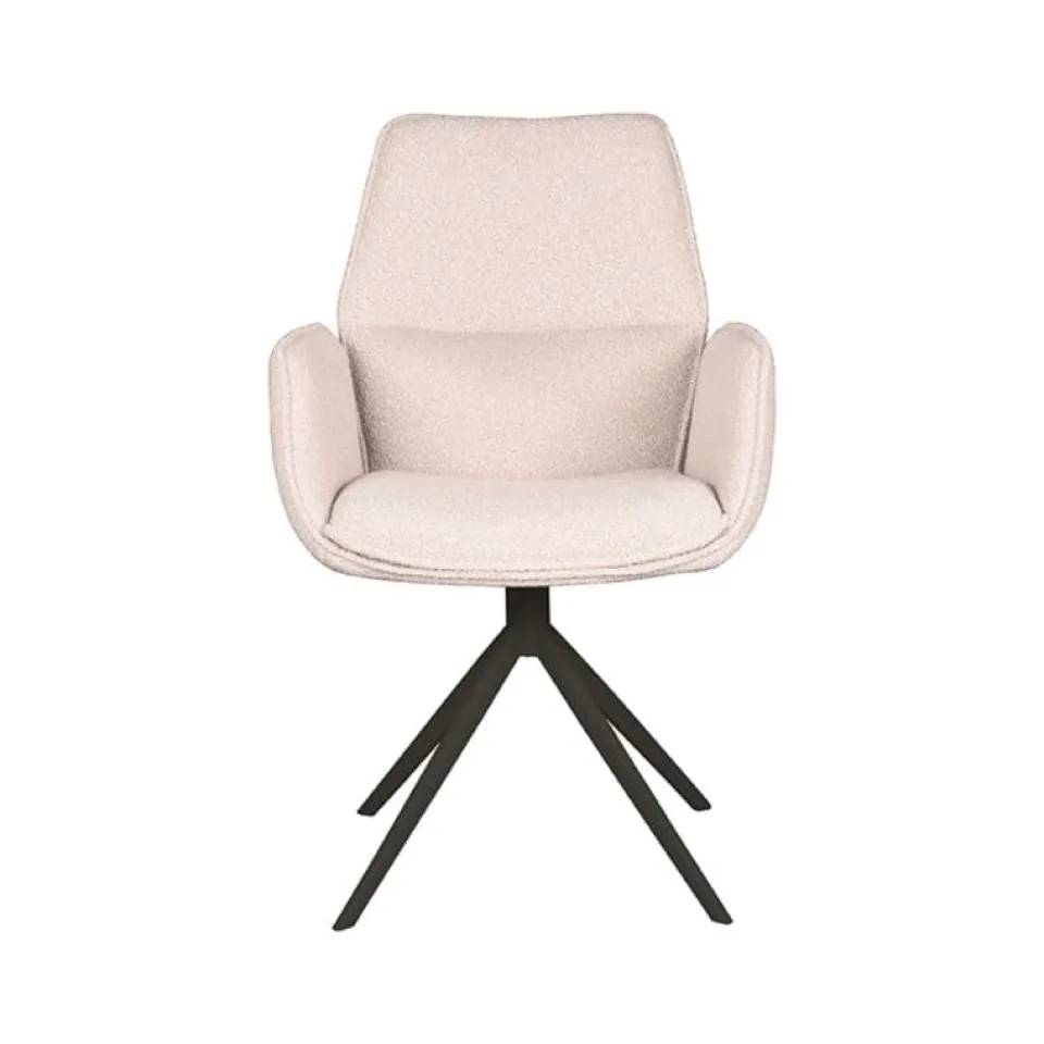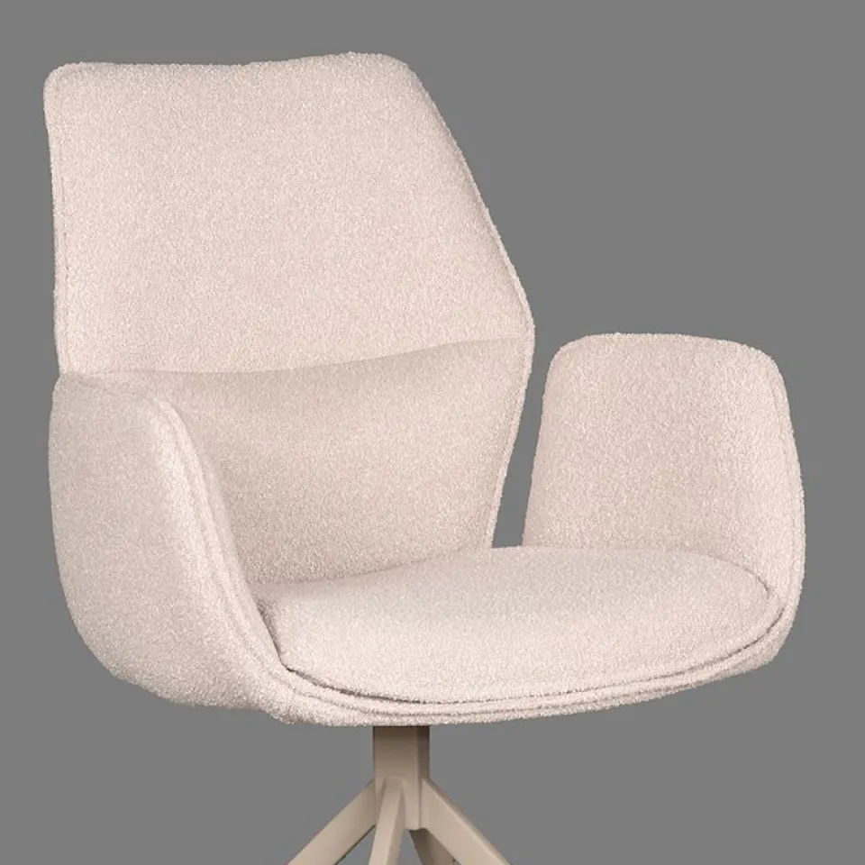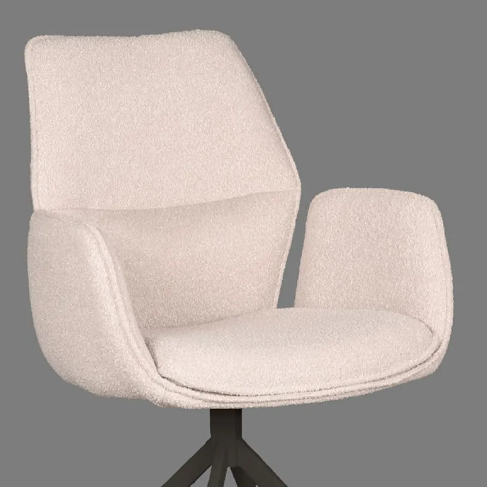 Eetkamerstoel Mellow van LABEL51 is een stijlvolle draaistoel met een zachte uitstraling en hoog comfortniveau. De zitting is bekleed met bouclé in de kleur Naturel Touch en heeft een uniek vormgegeven armleuning die de stoel extra karakter geeft. Het draaibare onderstel is uitgevoerd in zwart of taupe metaal en zorgt voor een moderne, stabiele basis. Dankzij het neutrale ontwerp past Mellow moeiteloos in zowel rustige als kleurrijke interieurs, van strak modern tot sfeervol Scandinavisch.