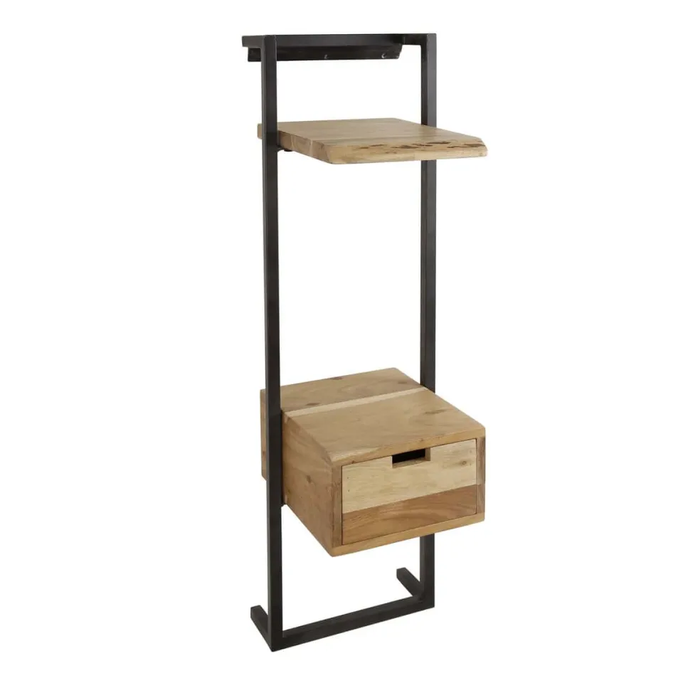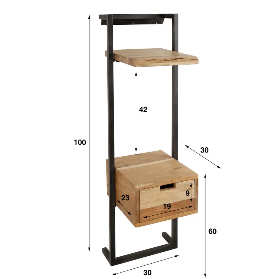 Nachtkastje Danies is gemaakt van acaciahout, afgewerkt met een matte, transparante lak. Het metalen frame zorgt voor een stevige constructie. Het metalen frame wordt eenvoudig aan de muur bevestig doormiddel van een strip met drie schroefgaten. Aan de strip kan het nachtkastje veilig worden opgehangen. Zie afbeelding voor meer details.